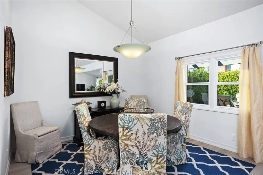 The central living area serves as the heart of the home, where skylights and windows flood the interior with natural light and vaulted ceilings create an atmosphere that feels open, airy, and inviting. Designed for both grand entertaining and intimate gatherings, the space flows effortlessly into the home’s dining area.