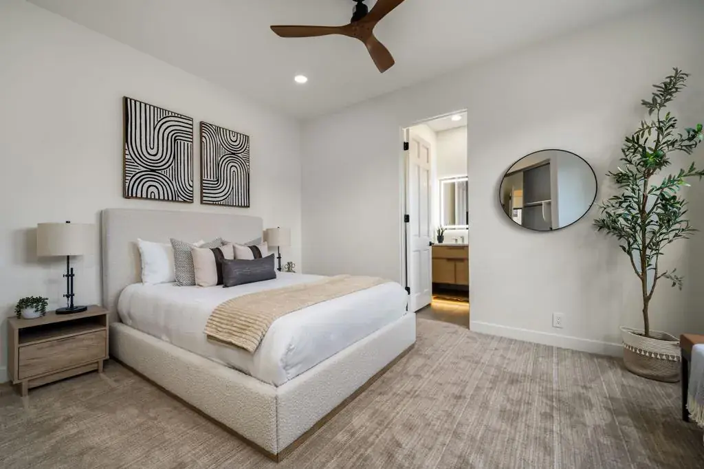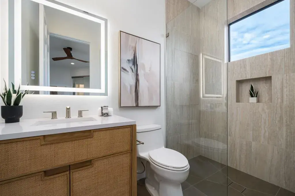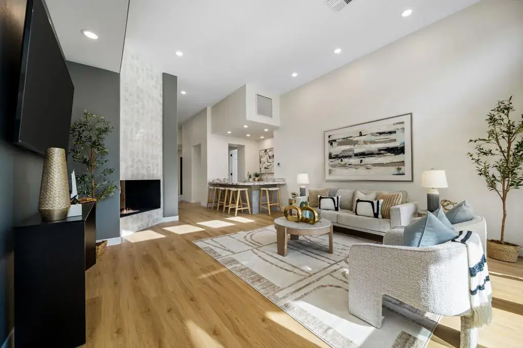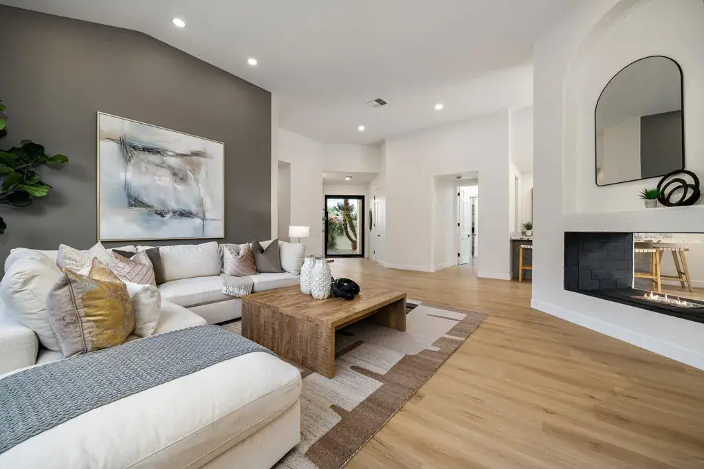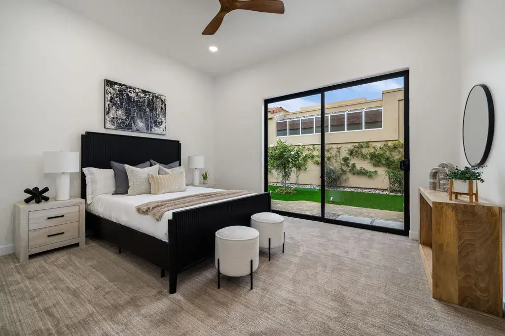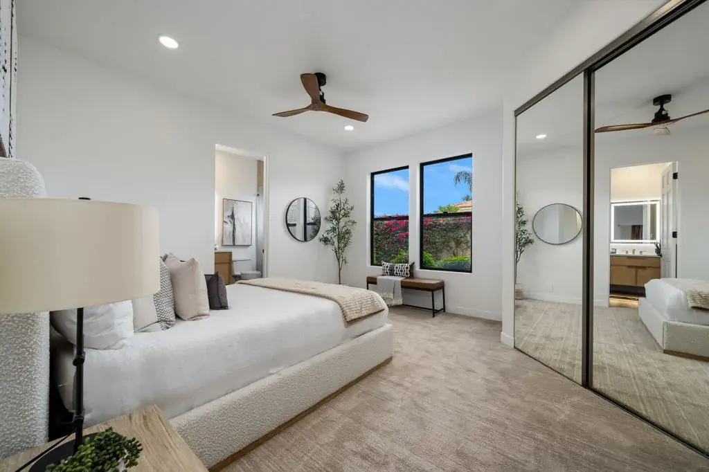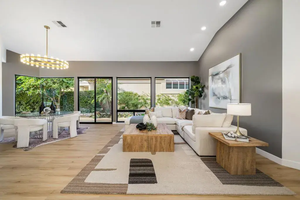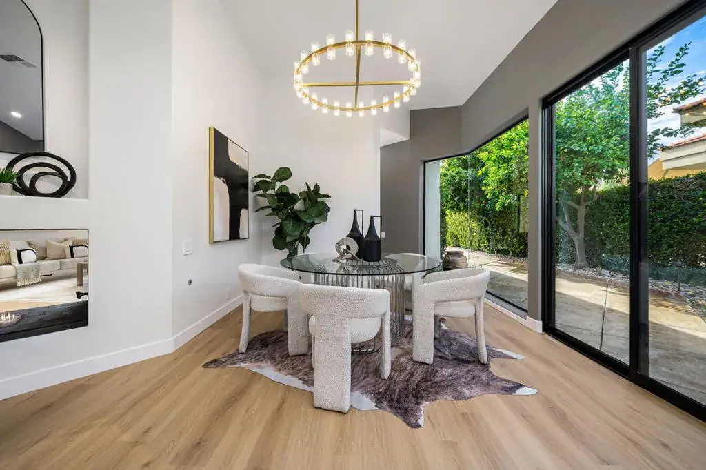 SOUTH FACING views from this stunning, beautiful REMODELED residence designed to captivate from the moment you arrive. Enter through the welcoming courtyard and step inside the impressive glass pivot door, where expansive views, contemporary design, a soothing color palette and thoughtful high-end updates unfold throughout the home. The bright, light home is enhanced by the walls of windows and the amazing VIEWS! This private pool retreat offers 2,871 sq. ft. of sophisticated living space, featuring three en-suite bedrooms, an elegant powder room, and an exceptionally spacious primary suite. The open-concept design flows seamlessly from the inviting family room to the refined living area, highlighted by a striking see-through fireplace, and leads into the dining space. The stylish bar serves as a natural gathering hub. The showpiece kitchen complete with a generous island and top-tier finishes is perfectly designed for unforgettable entertaining, all framed by captivating lake and mountain views.Outside, the SOUTH FACING pool enjoys abundant sunlight with generous awnings providing comfortable shade. A tranquil side patio offers an intimate outdoor escape–perfect for relaxation or accommodating a pet. Discover a home where luxury, comfort, and design come together seamlessly. The newest Desert Home Investors project is waiting for you!