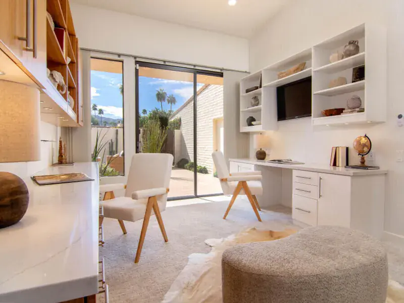 Set within the prestigious gates of Desert Horizons Country Club, this sophisticated Indian Wells residence delivers an elevated desert lifestyle defined by space, light, and breathtaking surroundings. Offering over 3,200 sq. ft., the home captures uninterrupted views of the golf course, serene water features, and mountain silhouettes, all framed by expansive glass that brings the outdoors in. The interior unfolds with a welcoming sense of scale, beginning with an elegant living room designed for both intimate evenings and stylish entertaining. A chef-inspired kitchen connects seamlessly to an inviting den–an ideal setting for relaxed gatherings and everyday comfort. The thoughtfully reconfigured primary suite is a private sanctuary, complete with a flexible bonus area perfect for a gym, office, or retreat space, custom walk-in closets, and a luxurious spa-style bath.Guest accommodations are equally refined. One ensuite bedroom opens to calming courtyard and mountain views, while an additional room has been transformed into a custom dual-workstation office with built-in cabinetry–perfect for today’s modern lifestyle. The home also features an atrium and skylights throughout. Upgrades include, new flooring, new plush bedroom carpeting, a redesigned powder room, fresh interior paint, updated contemporary lighting. Behind the scenes, the residence has been enhanced with dual newer 4-ton AC systems, a newer water heater, epoxy-coated garage floors, two EV charging stations, wine coolers, and a leased solar system–delivering comfort, efficiency, and peace of mind. Ownership includes access to Desert Horizons’ newly completed clubhouse, a striking desert-modern destination featuring a full-service restaurant and bar, casual cafe, expansive wellness and fitness center, pro shop, and a premier racquet complex with pickleball and tennis courts. Moments from the dining, shopping, and cultural offerings of Indian Wells, this home offers a rare blend of privacy, prestige, and resort-caliber living. Buyers are responsible for verifying the accuracy of all information.
