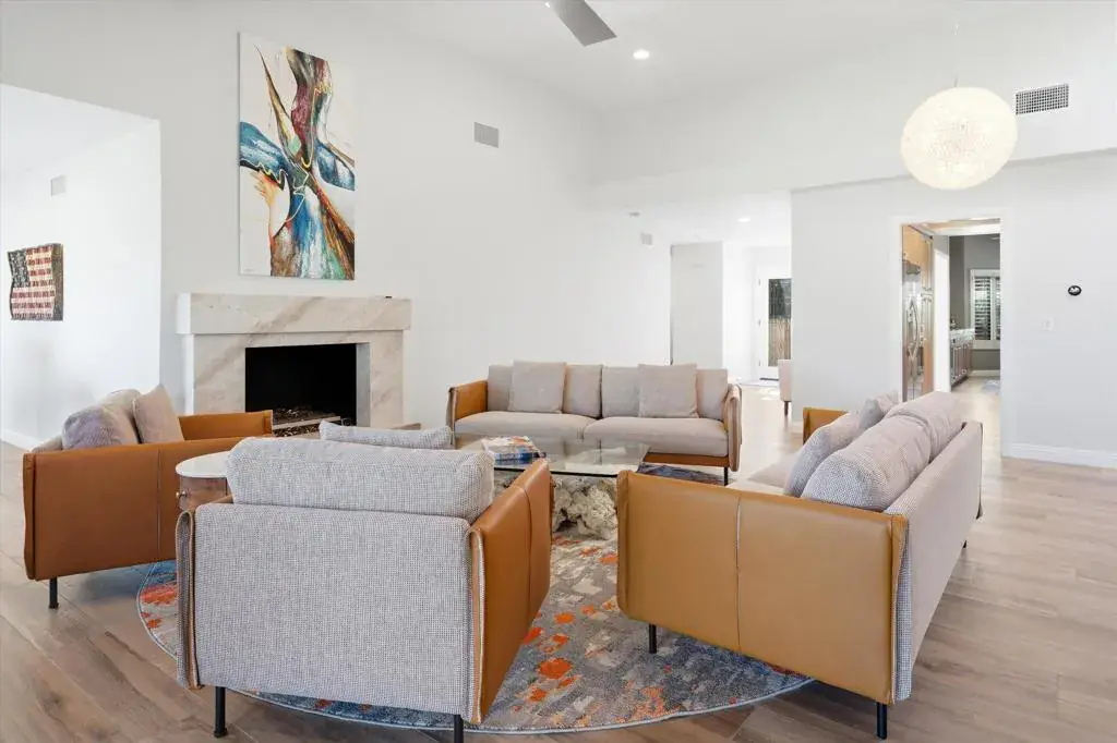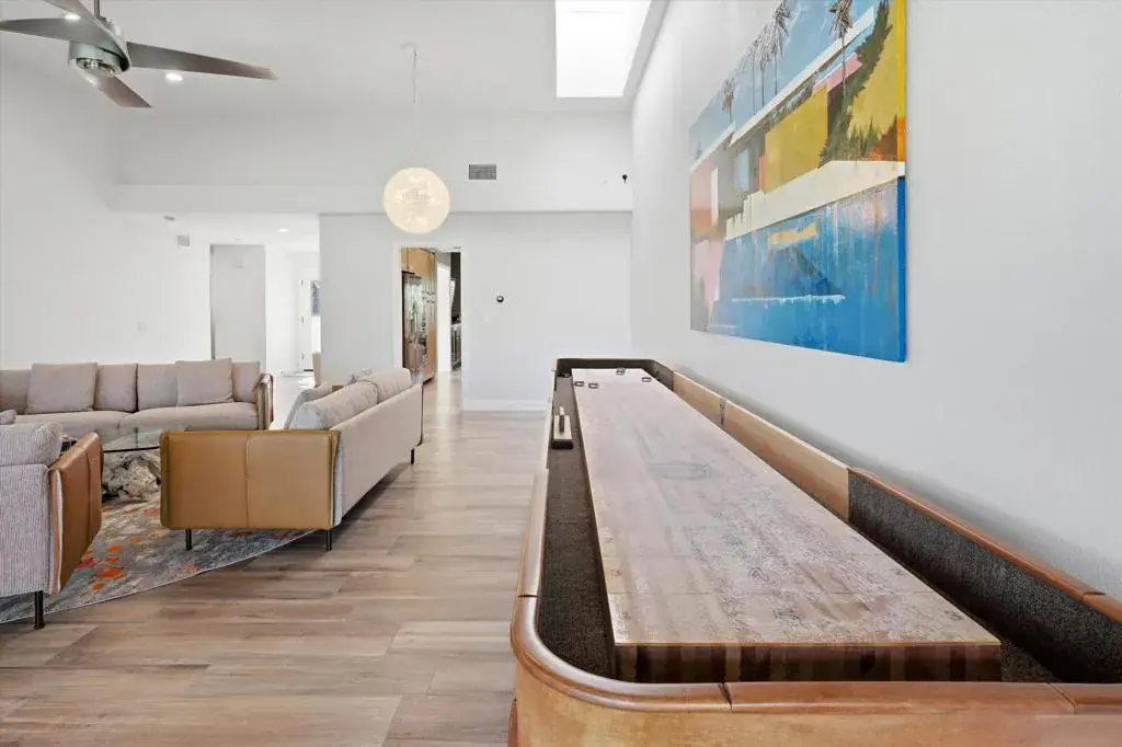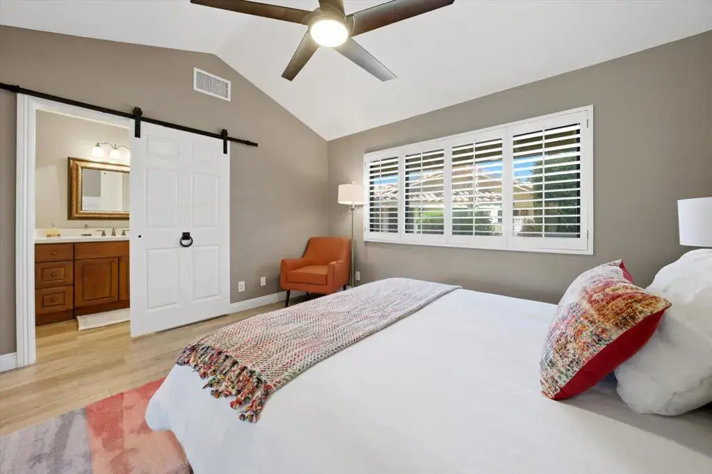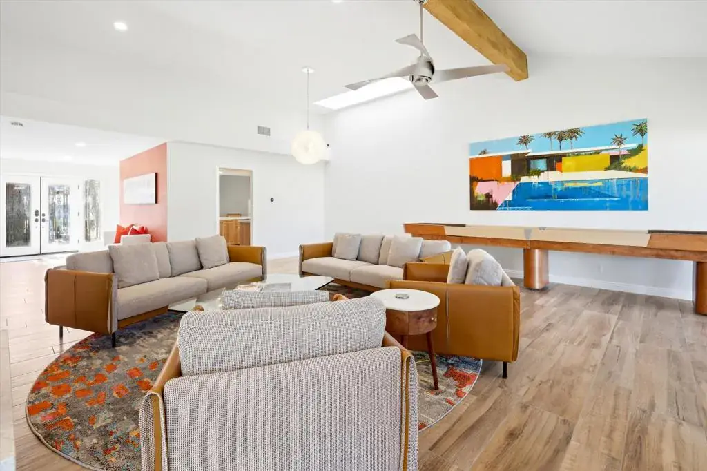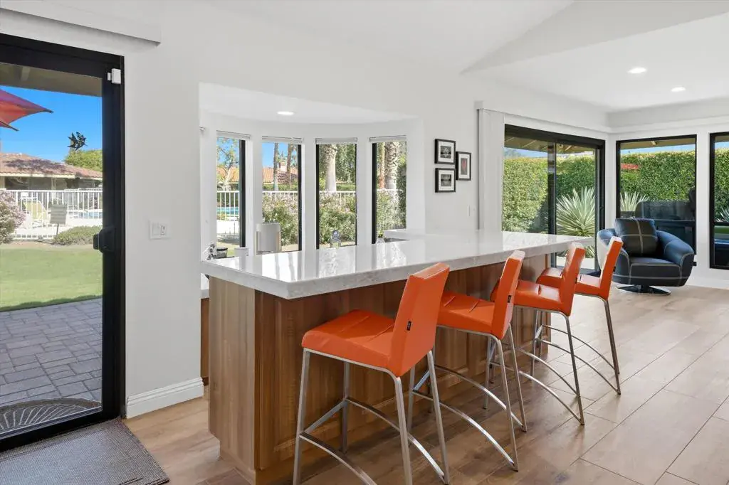 An exceptional Bergheer residence in the prestigious, guard-gated Sandpiper enclave of Indian Wells Country Club. This impeccably reimagined condominium masterfully blends iconic desert architecture with elevated finishes and advanced energy efficiency.A private gated courtyard offers a refined arrival, framed by curated desert landscaping and vibrant blooms. Expansive paver hardscape flows seamlessly from driveway to entry, courtyard, and rear patio, creating effortless indoor-outdoor living. The tranquil outdoor spaces, appointed with infrared gas heaters, are ideal for morning coffee or intimate evenings under the stars, just steps from the community pool and spa.Inside, soaring vaulted ceilings and an expansive open-concept great room establish a dramatic yet inviting ambiance. A gas fireplace with elegant quartz anchors the living areas, while a stylish wet bar opens directly to the rear patio. The spacious office/den provides flexible space for guests or executive work. High-efficiency Milgard windows and doors, including striking curved bay windows bathe interiors in natural light and frame panoramic mountain views. The designer kitchen features quartz countertops, custom cabinetry, bar seating, and premium appliances. Custom built-ins with integrated wine cooler enhance the family room, ensuring seamless flow. The primary suite impresses with tray ceilings, quartz-surrounded gas fireplace, generous closets, and spa-inspired bath with dual vanities, deep soaking tub, and glass-enclosed shower. The guest suite offers complete privacy with en-suite bath. Designer touches include Hunter Douglas window treatments, luxury tile plank flooring, high-end fixtures, professionally curated furnishings, and a custom shuffleboard table add distinctive flair for refined entertaining.Crowning the home is a fully owned 7.85 kW SunPower solar system (24 Maxeon panels), generating ~12,513 kWh annually and reducing electric costs to ~$17/month. Additional upgrades encompass all-newer HVAC zoning with fresh ductwork, enhanced attic insulation (residence and garage), instantaneous gas water heater with recirculation, water softener, and garage split-system heat pump. The two-car garage plus golf cart space provides abundant storage. Offered fully furnished (exclusions apply), this rare Bergheer gem delivers sophisticated desert luxury in one of Indian Wells’ most coveted communities, low-maintenance, high-efficiency, and resort-ready.