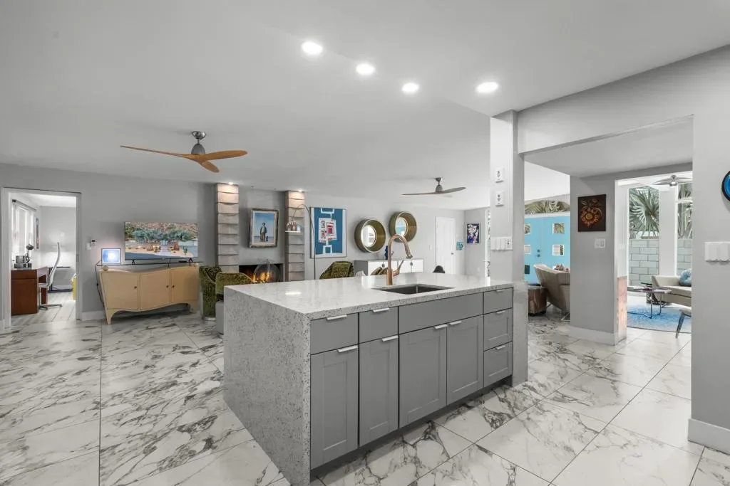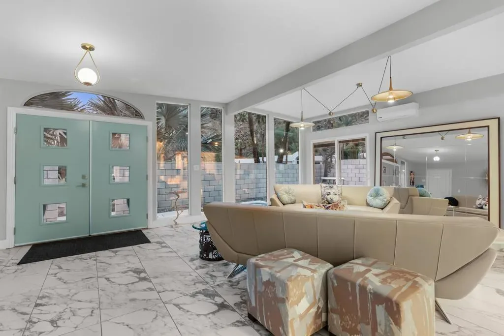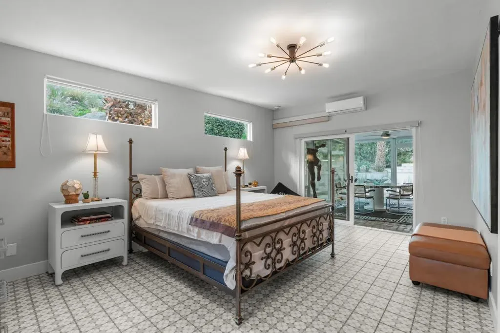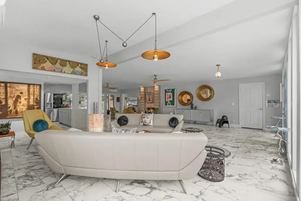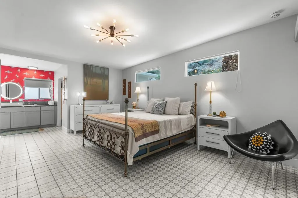 A rare architectural find, this authentic mid-century modern A-frame is tucked away on a quiet cul-de-sac inside the prestigious, 24-hour guard-gated Indian Wells Country Club with no HOA fees. Set against the dramatic backdrop of the Santa Rosa Mountains, this home offers a unique blend of privacy, history, and timeless design. Located in one of the desert’s most storied neighborhoods once home to Hollywood legends Desi Arnaz and Lucille Ball, this property is a true piece of Indian Wells history. Walls of glass and soaring ceilings flood the home with natural light, highlighting the clean lines and iconic angles that define mid-century architecture. The open-concept layout seamlessly connects the upgraded kitchen, dining area, and expansive great room, all centered around a warm, inviting fireplace, perfect for both relaxed living and entertaining. Thoughtfully designed for privacy, the three bedrooms are well separated, creating comfortable retreats for owners and guests alike. Notable upgrades include new windows, a remodeled kitchen and bathrooms, EV charger, a new AC system with six individual mini splits for room by room climate control, and an enclosed sunroom lounge perfectly positioned to take in the mountain views. Every update enhances comfort while preserving the home’s architectural integrity. Step outside to enjoy direct access to a serene community pool just steps from the front door, ideal for effortless desert living. A two car garage adds convenience, while the peaceful setting reinforces the home’s resort like feel. Whether you’re looking for a full time residence, a weekend escape, or a sophisticated investment, this home delivers iconic style, modern comfort, and a truly special location. An entertainer’s dream and a rare opportunity to own a piece of Indian Wells history.