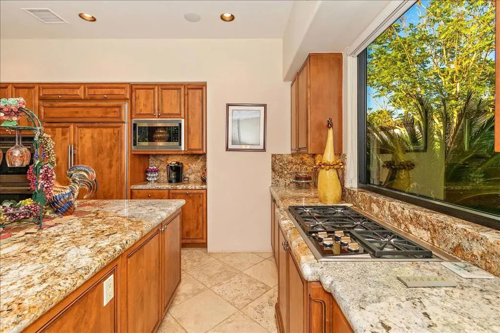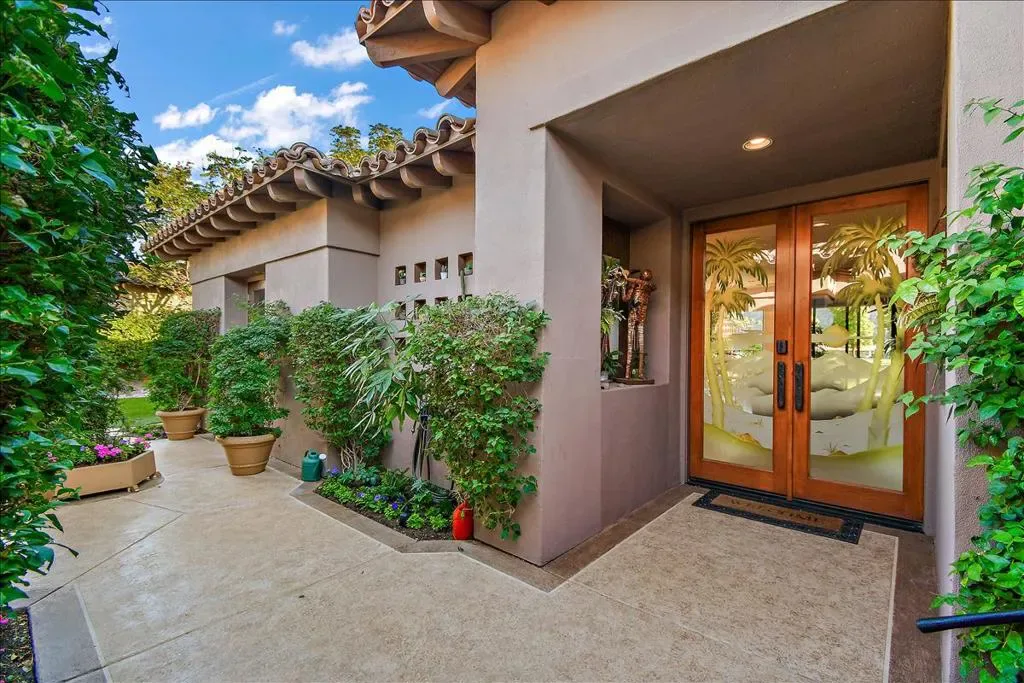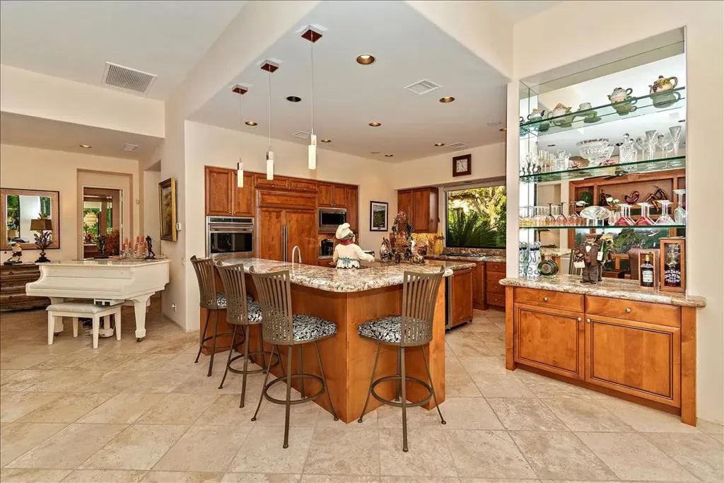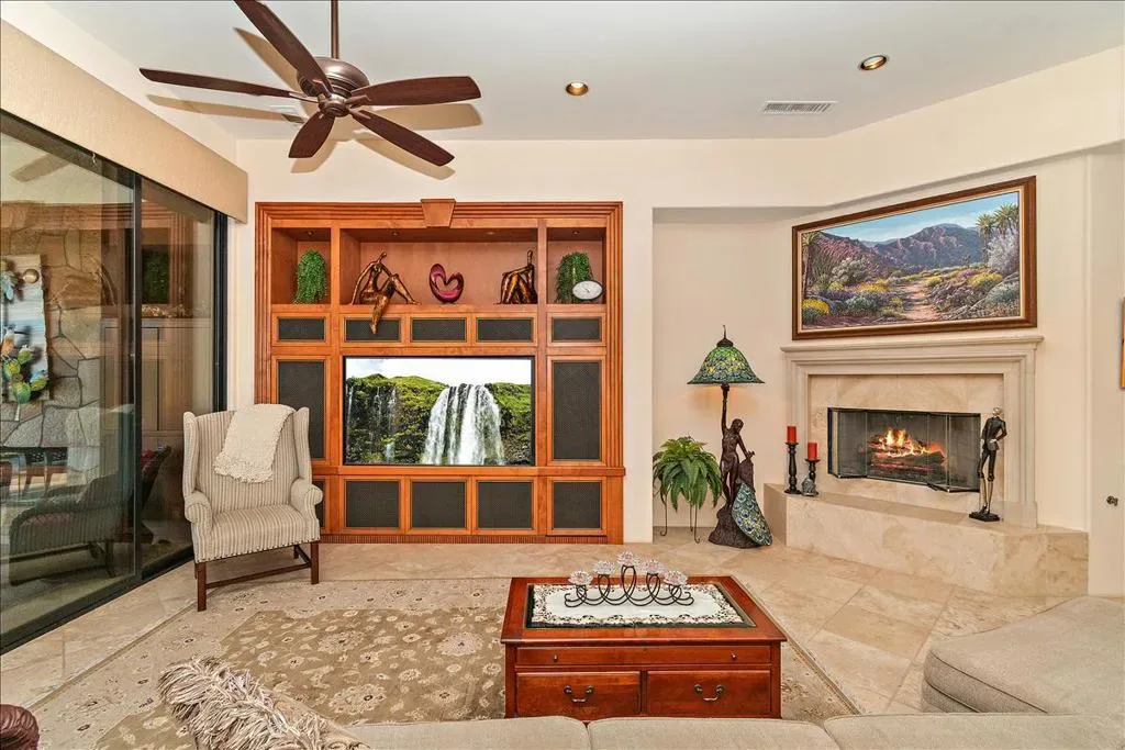 This is the home you have been waiting for! You will be amazed as you enter the gate of this picture perfect home in Indian Wells CC with 4 bedrooms (one bedroom is a detached casita), 4.5 baths, 3 car garage plus golf cart garage. The spectacular panoramic south mountain, lake, and golf course views are some of the best in the desert. This immaculately maintained gorgeous home has it all- great room plan with high ceilings and fireplace, chiseled travertine floors, slab granite in the kitchen with almost new appliances and oversized walk in pantry, dry bar, built in office or 4th bedroom, master suite with fireplace, double vanities, large tub, bidet, walk in shower, and supersized double closets. All the bedrooms have ensuite baths. The oversized detached courtyard casita has breakfast bar and mini refrigerator, fireplace, living area, ensuite bath, walk in closet, and private patio. The fabulous lushly landscaped outdoor area features a rose garden, fruit trees, large area for entertaining, artificial turf, misters, fire pit, built in BBQ with stacked stone facade, and bar, covered patio area with stone pillars and wall with fireplace, misters, large infinity pool and spa, coated concrete throughout the outdoor area. The garage has a split AC, cabinets, and epoxy floors. There many more upgrades that are too numerous to name. There is no HOA fee though there is manned gate. Please come and view this unbelievably beautiful home and see for yourself! You can enjoy paradise with a breathtaking view in a prime location every day.