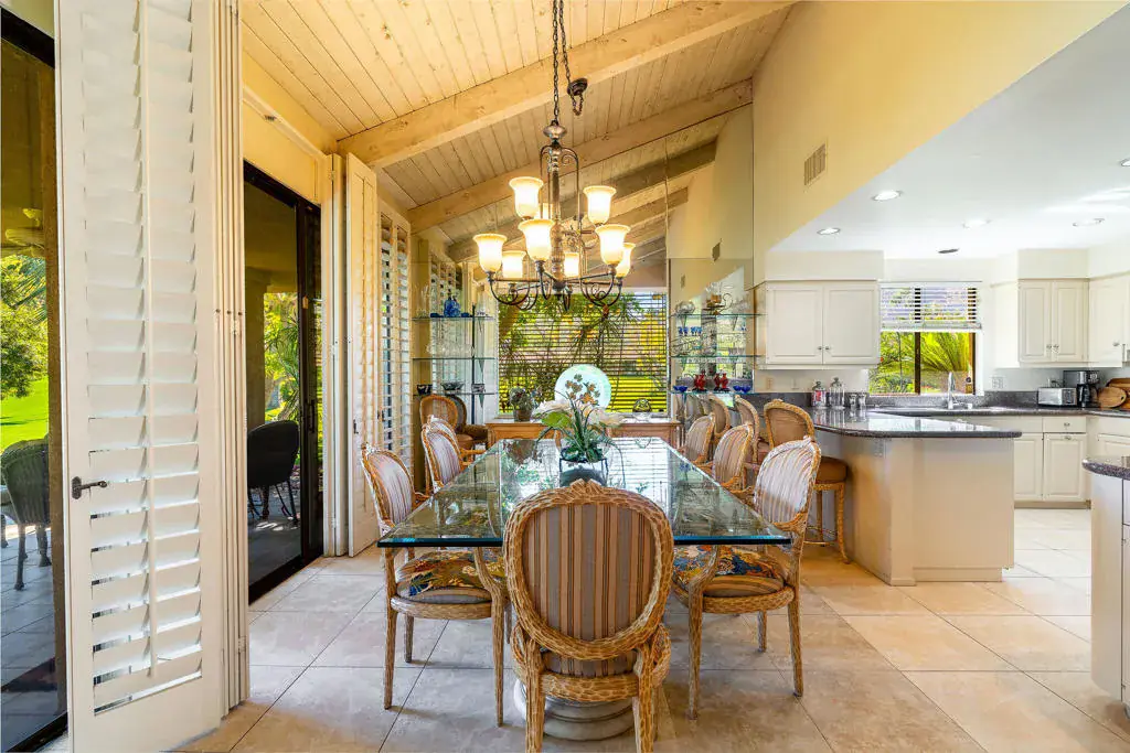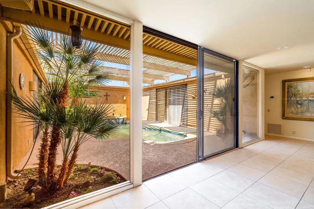 Exceptional 3 bedroom, 3 bath condo in the Indian Wells Country Club beautifully situated on the 17th Green of the Cove Course. Long private driveway.A brick pathway with Mountain Views and an outstanding, flowered greenbelt leads to the front door. Pick grapefruit, lemons and tangerines from your own trees on your way in. Expansive covered patio with gas grill.The living room with large fireplace, dining room, kitchen, primary bedroom and office have views of the 17th green of the Cove Course. Primary bedroom has 24 sq. ft. added for office or additional living.The Primary bath offers built- in custom cabinetry, raised vanities, copious storage and a large walk-in closet. An Atrium with a large heated spool with waterfall can be seen through custom sliders from the living room and 2 guest suites with baths. Updated kitchen surrounded by views includes a floor to ceiling Sub-Zero wine cooler.Garage is a 2 car plus a golf cart garage with laundry. Most furnishings are included. Outdoor community pool and hot tub is nearby. New tile roof on July 9th.