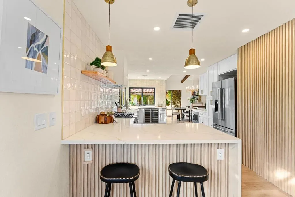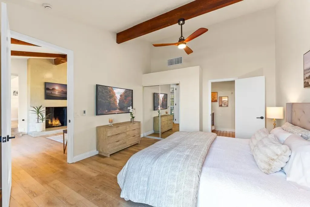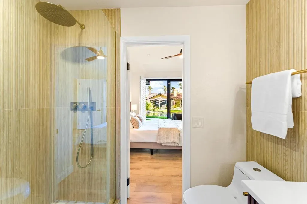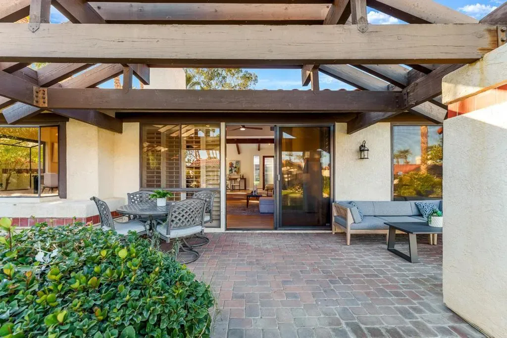 Extensively remodeled unfurnished long-term rental located in the prestigious gated community of Los Lagos in Indian Wells. This beautifully updated residence offers approximately 2,448 sq ft of open living space with vaulted wood-beamed ceilings and an upgraded fireplace with custom concrete finish. The home features upgraded appliances, custom kitchen cabinetry, updated flooring, fresh interior paint, remodeled bathrooms, and contemporary fixtures throughout. Enjoy serene lake and waterfall views from the kitchen, living room, den, and primary bedroom, creating a peaceful indoor-outdoor living experience. Detached casita with raised wood-beamed ceilings, updated flooring, and remodeled bathroom provides a private space for guests, extended family, or office use. Converted golf cart garage adds versatile bonus room ideal for gym, office, or creative studio. Outdoor areas feature interlocking brick pavers connecting patio and driveway, perfect for relaxing or entertaining. Situated in a quiet prime location within Los Lagos, a private community of 89 homes across 35 acres of lush landscaping, lakes, and waterfalls. Residents enjoy exclusive Indian Wells benefits including discounts to the BNP Paribas Open and local amenities. Rare opportunity to lease a fully upgraded unfurnished home in one of Indian Wells’ most desirable communities.