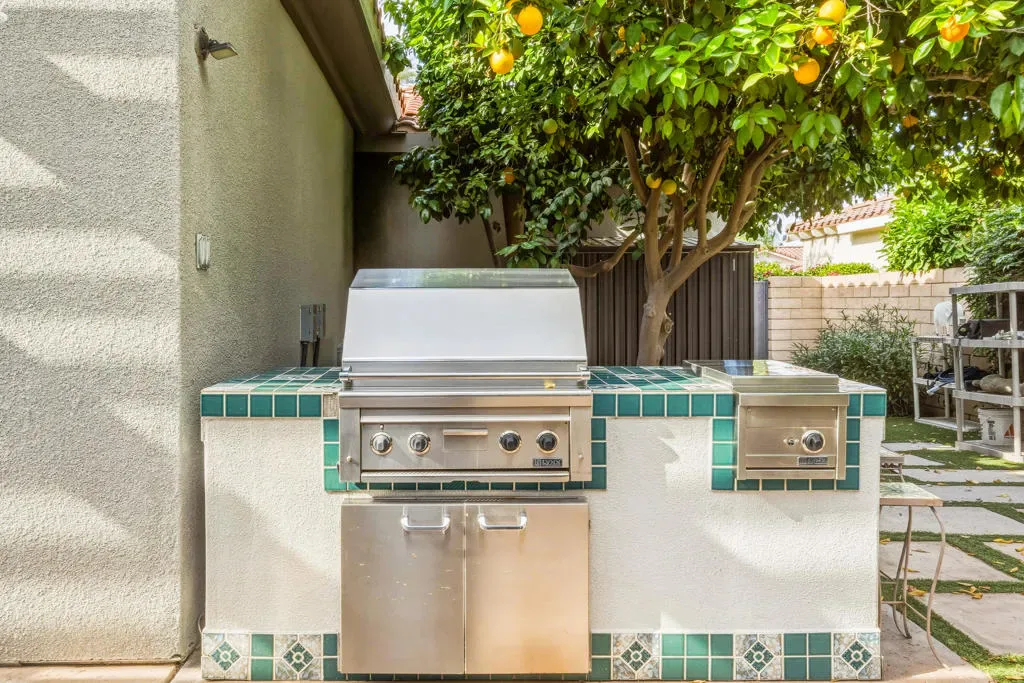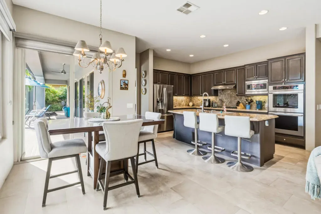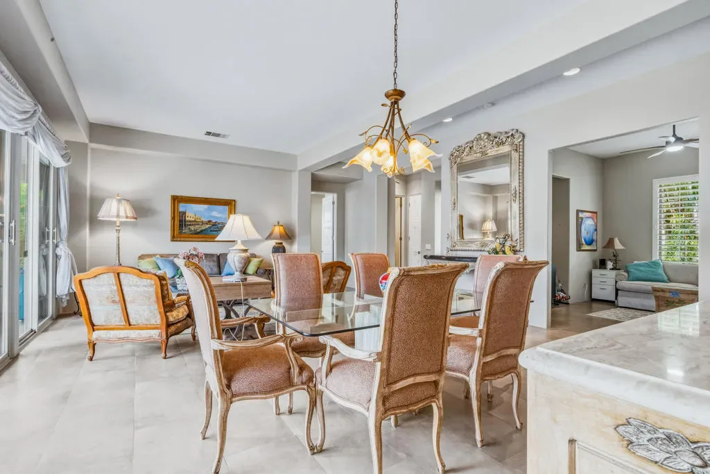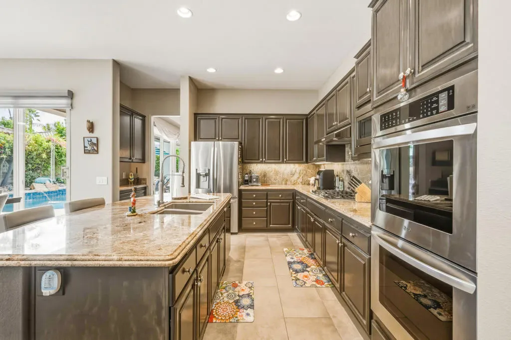 This contemporary Mediterranean-style residence is in the intimate gated enclave of Sundance, in the heart of Indian Wells. Professionally designed accent-lighted desert landscaping surrounds the home adding to impressive property appeal. Beautiful palm trees and other varietals create a pleasant environment consisting of low-maintenance plantings throughout the grounds. An expanded rear patio has a southern orientation that maximizes the all-day sunlight. A pergola design-element with heater, fans, soothing fountain, adjacent gas fire pit, and built-in BBQ enhances outdoor entertainment. The salt-water pool with spray water features, accent lighting, and cascading spa have been resurfaced with mini pebble-tech. Porcelain tile flooring has been installed throughout the main living areas that include a formal living room and dining area. The open kitchen, breakfast nook, and family room area has been enlarged from the original square footage by adding approximately 60 SF by moving out the back wall to create an expanded great room. The kitchen features slab granite counter tops, back splashes, island with sink and breakfast bar, and newer upgraded stainless appliances. The family room focus is a custom designed contemporary gas fireplace with a flat screen TV above. The home’s interior floor plan consists of two primary bedroom suites on each side of the home, with a third potential sleeping area that is currently designed as an office/den space. The Primary bedroom has wood-like vinyl flooring, and the bath and shower area were upgraded with contemporary cabinetry and porcelain tile flooring and walls.