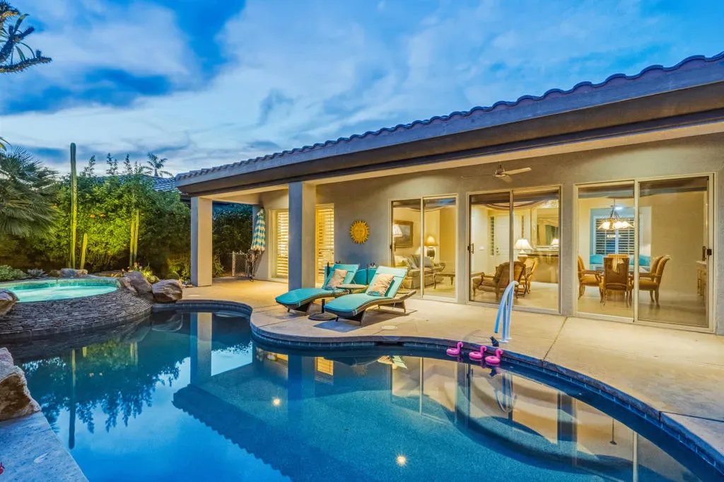 This beautifully upgraded contemporary Mediterranean home is located in the intimate gated enclave of Sundance in Indian Wells. Lush, accent-lit desert landscaping and soaring palms create a private, low-maintenance oasis.Enjoy seamless indoor-outdoor living with a south-facing expanded patio featuring a pergola with heaters and fans, a built-in BBQ, a fire pit, and a tranquil fountain. The resort-style **saltwater pool with chiller–ideal for desert summers–and cascading spa** has been resurfaced in mini pebble-tech and enhanced with ambient lighting.Inside, porcelain tile flooring flows throughout, leading to an expanded great room that opens to a chef’s kitchen with slab granite counters, a center island, and upgraded stainless steel appliances. A custom contemporary fireplace anchors the family room.The flexible floor plan offers two private primary suites and a versatile den/office. The main suite features carpet and a beautifully updated spa-like bath. A perfect blend of style, comfort, and effortless desert living.