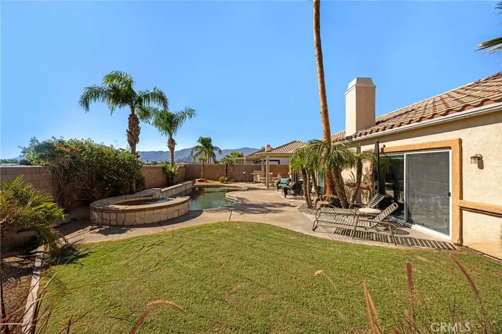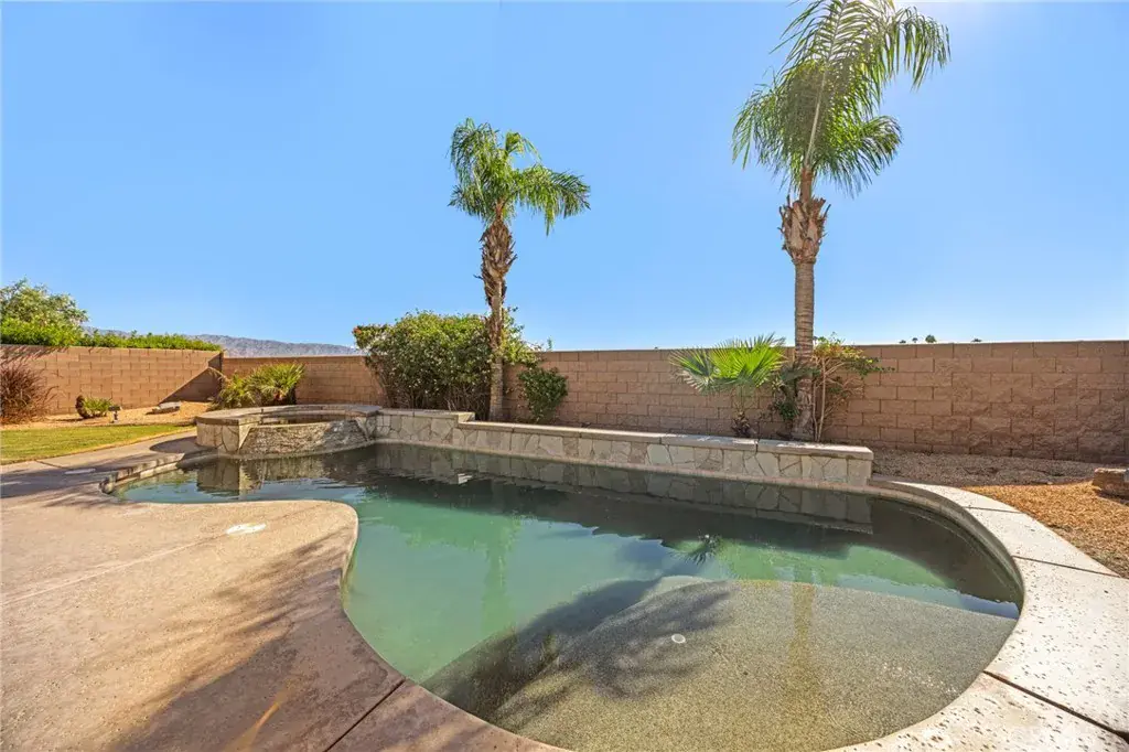 Welcome to Indian Springs, a guard-gated community, where you can enjoy golf course amenities while maintaining privacy in this beautiful pool home. This is a single-level home with 3 bedrooms 2 bathrooms and sits on a large lot and offers the perfect blend of comfort, functionality, & relaxation. Step inside to a spacious open floor plan, perfect for entertaining friends & family. A beautiful oversized bar area attached to the great room is the perfect centerpiece for the big game or movie nights! As you walk through the front door you will notice the upgraded fireplace with natural stone pillars to match. The large primary suite features an attached bath with a separate soaking tub, shower. The two guest bedrooms are good size. The low HOA dues include front landscaping, making this home even more appealing for low-maintenance living. Outside, the pool & spa are the centerpiece of the backyard oasis, where you can enjoy the beautiful weather and relax on the patio while taking in the breathtaking sunsets. For a change of pace, head over to the Indian Springs Clubhouse & Restaurant, where you can watch the golfers, savor a delicious meal, or dance the night away to live music. The community also offers two pools with BBQ areas for hosting larger gatherings, hot tubs, exercise rooms, & meeting spaces. Located just minutes from world-class golf, tennis, pickleball, shopping, dining, hiking, biking, & the Acrisure Arena for sports & entertainment, this home offers everything you need to embrace the desert lifestyle.