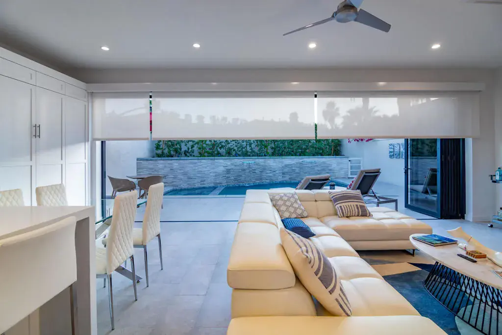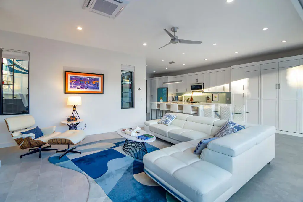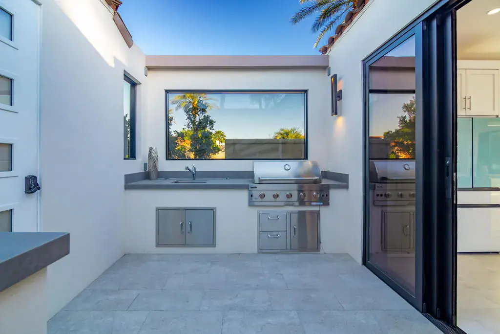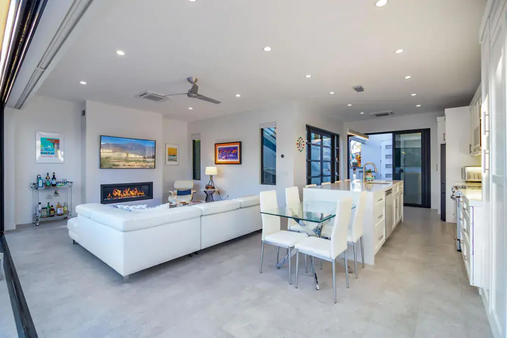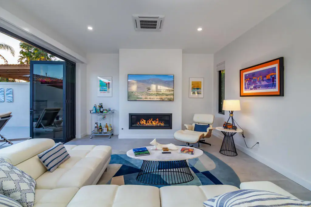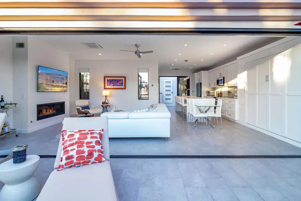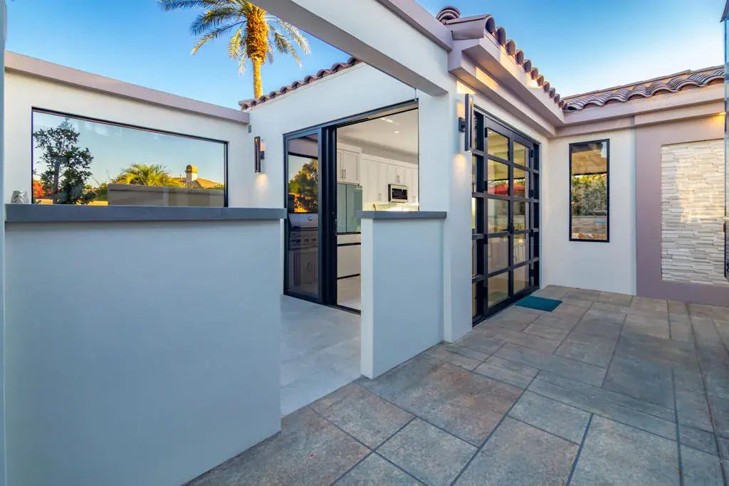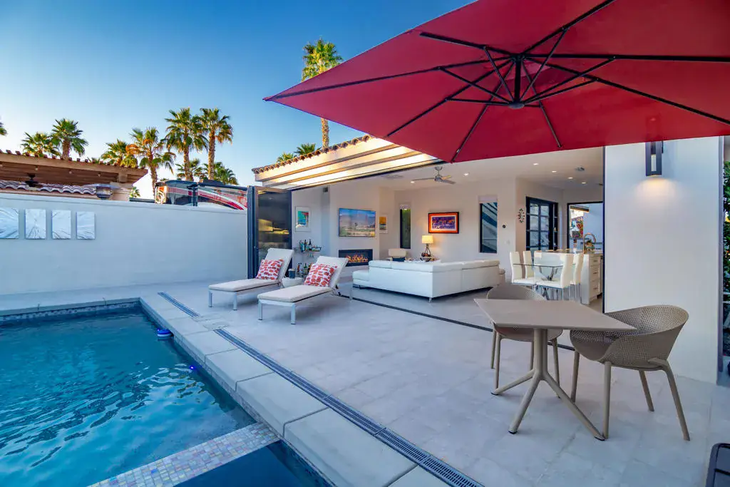 Welcome to Lot 68, a newly completed, turnkey retreat by Unique Islands, offering the pinnacle of luxury motorcoach living. Nestled along the south perimeter wall of the resort, this privacy lot boasts a fully enclosed yard, ideal for pet owners and those seeking tranquility. At the heart of the property is a 600 sq. ft. tile-roof shade structure, blending modern design with functionality. Inside, high ceilings and an open layout create an airy ambiance. The gourmet kitchen features sleek quartz countertops, a waterfall island with seating for four, and high-end appliances. A real gas fireplace anchors the stylish living area, while a King-size Murphy bed adds versatility. Lanai bi-folding doors open completely, extending the living space onto a porcelain-tiled pool deck. This private backyard oasis includes a resort-style pool with LED-lit waterfalls cascading into an integrated spa. A high rear privacy wall lined with a lush ficus hedge ensures a serene setting. The detached casita offers a spa-like escape, featuring dual vanities, a striking full-glass tiled wall, and a spacious walk-in shower with natural light and a bench. Between the shade structure and casita, an outdoor kitchen with a built-in BBQ awaits, thoughtfully designed for future enclosure, pending MCC regulations. Additional features include a Versailles-pattern epoxy overlay on the coach pad, artificial turf, low-maintenance landscaping, and dedicated golf cart parking with a charging outlet. Offered at $795,000, this property is ready for immediate enjoyment. Showings are by appointment only. Contact Carli Boosalis at 760-619-8038 for more information.