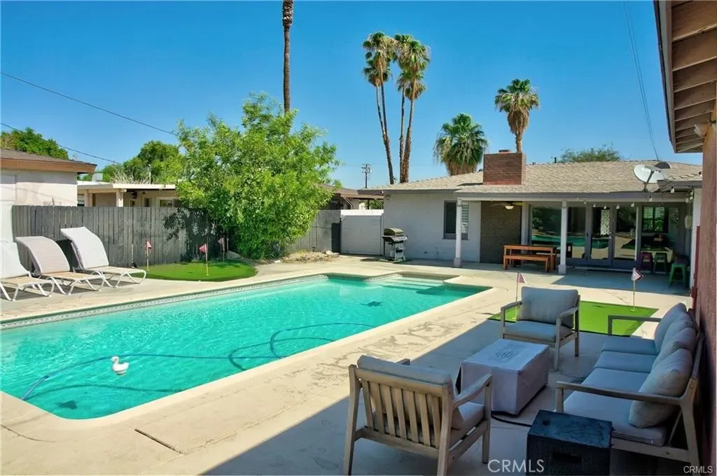 Discover the ultimate desert oasis in the heart of Indio! This beautifully remodeled 4-bedroom, 2-bathroom single-story home combines mid-century charm with modern upgrades, offering an expansive floor plan and a private backyard paradise with stunning mountain views. Whether you are looking for a primary residence, a vacation getaway, or a turnkey investment, this property is designed to impress. Enjoy an open-concept layout featuring durable laminate and ceramic tile flooring throughout for easy maintenance. The modern kitchen includes updated appliances, a dishwasher, and convenient indoor laundry hookups. Stay cool with central air conditioning and ceiling fans, or cozy up by the gas-log fireplace in the family room during cooler winter evenings. The 4-bedroom configuration provides ample room for family, guests, or a home office, with some past listings even featuring a converted garage for a dedicated game room. Dive into your own gunite in-ground pool, perfectly positioned to capture the desert sun. Unobstructed mountain vistas serve as the perfect backdrop for your outdoor gatherings. The property includes a large driveway with room for multiple vehicles and potential for RV parking. Enjoy the freedom of a property with no homeowners association fees. Centrally located near shopping, dining, and local attractions like the Coachella Valley History Museum and the world-famous Empire Polo Club. Easy access to Highway 111 and Interstate 10 makes commuting through the Coachella Valley a breeze.