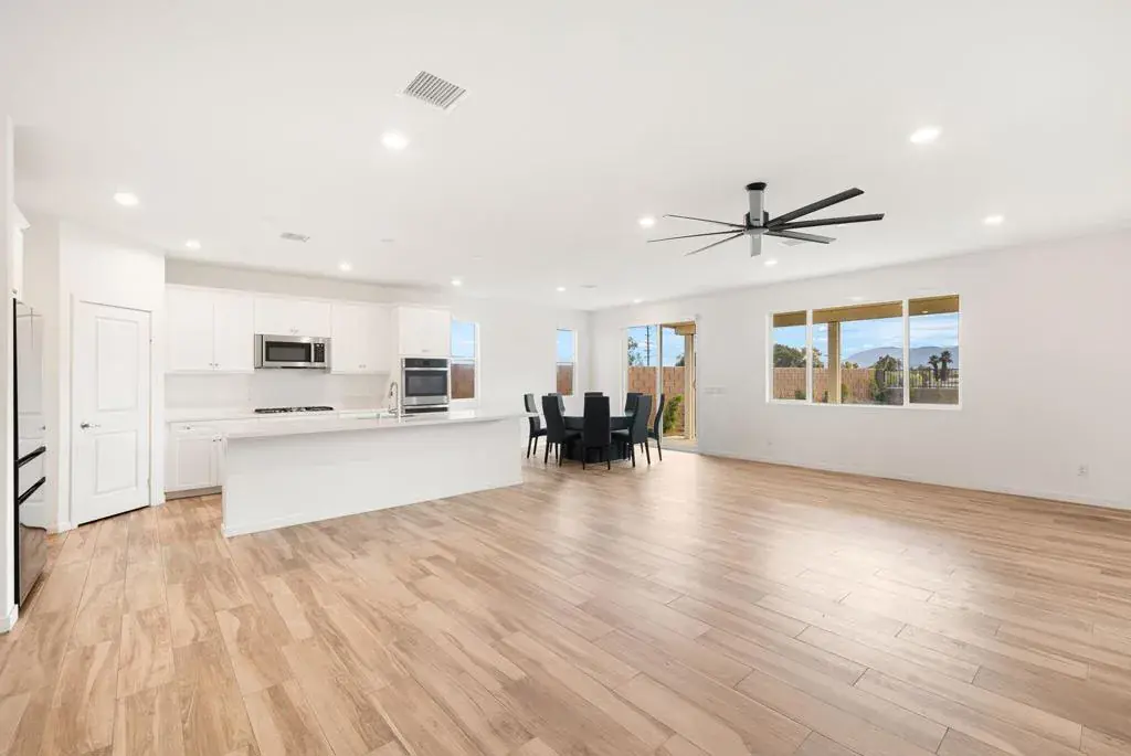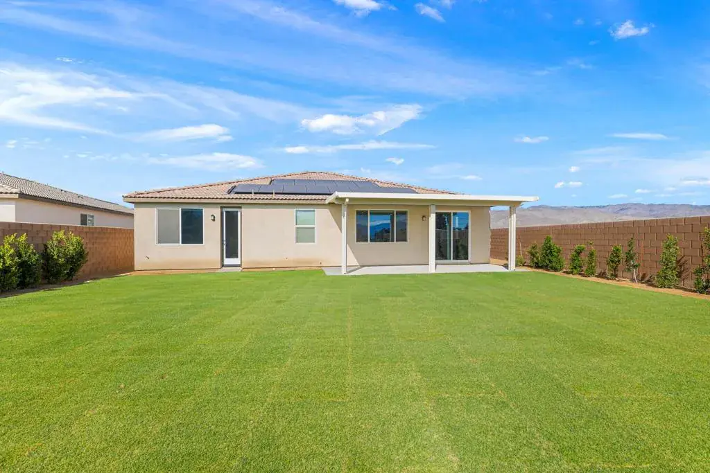 Built in 2021, this modern 4-bedroom, 2-bath home offers the perfect combination of style, space, and functionality. Featuring very high ceilings and an open-concept floor plan, the living, dining, and kitchen areas feel bright and expansive- ideal for everyday living and entertaining.The chef’s kitchen showcases quartz countertops, stainless steel appliances, a gas range and oven, microwave, dishwasher, and a large refrigerator. Washer and dryer are also included for added convenience. Beautiful tile flooring runs throughout the main living areas and primary bedroom, while 3 of the bedrooms are comfortably finished with carpet.Every bedroom is generously sized, offering ample space and comfort. The spacious primary suite includes a walk-in closet and a well-appointed bathroom designed for privacy and relaxation.The front yard is beautifully landscaped, creating strong curb appeal, while the expansive backyard features lush green grass and thoughtfully designed landscaping- perfect for relaxing or entertaining. All set on a large lot with mountain views as your backdrop.Additional highlights include owned solar for energy efficiency and low electric costs, a three-car configuration with a two-car garage plus a separate golf cart garage, and HOA dues covered by the landlord.Offered unfurnished as a long-term lease, this bright, airy, and move-in ready home delivers modern comfort, generous space, and refined outdoor living.