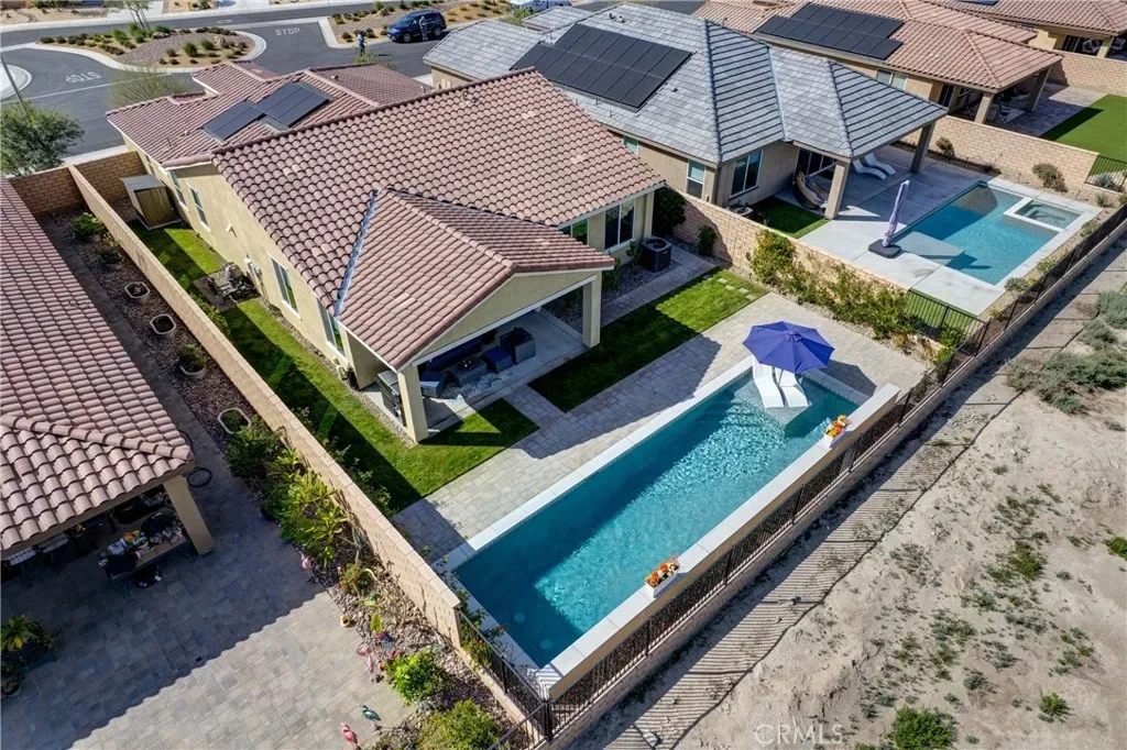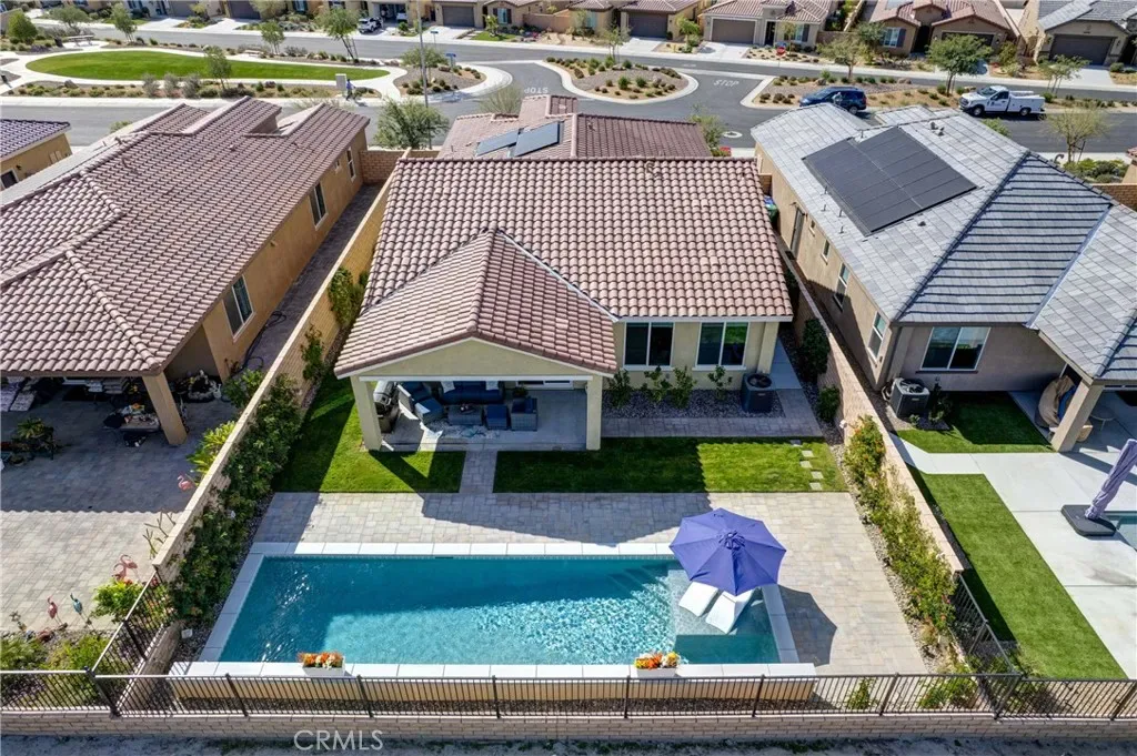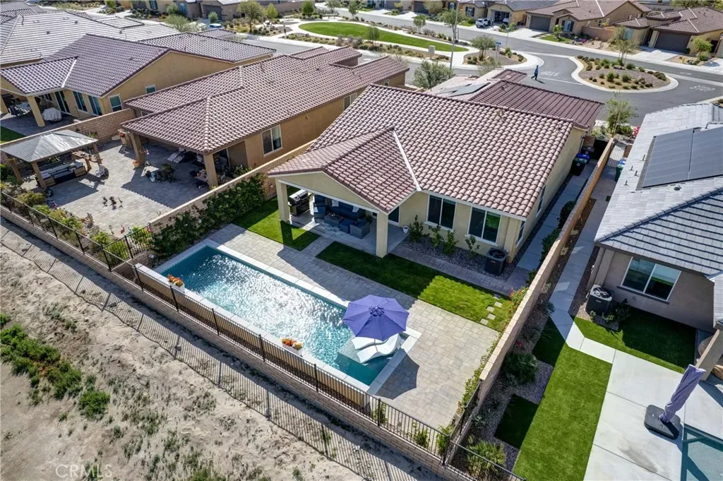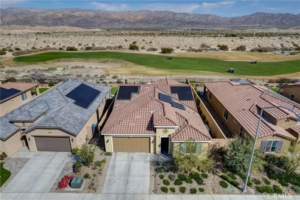 One of the best lots overlooking the 16th fairway in the highly sought-after Four Seasons at Terra Lago, an exclusive 55+ gated community. This single-story home offers nearly 2,200 sq ft of living space, 3 bedrooms, 3 bathrooms on a 6,970 sq ft lot with breathtaking mountain and golf course views, this premier homesite originally came with a $50,000 lot premium — a reflection of its desirability. Built in 2024 with over $150,000 in upgrades, no detail has been overlooked. Enjoy the beautifully constructed pebble-tech pool by the renowned Teserra Outdoor Living which includes a baja shelf with in-pool loungers, water features, paver hardscape and lush lawn. A covered outdoor room with LED lighting enhances the space, while Smart Aqua Link controls and drought-resistant landscaping on timers provide convenience. The spacious kitchen is highlighted by a large island with seating for 6+, white shaker cabinetry, quartz countertops, designer backsplash, walk-in pantry, and GE Profile stainless appliances including a 5-burner gas cooktop with vented hood and 36″ double oven. The great room with fireplace opens seamlessly to the outdoor living area on one side and the kitchen and dining on the other: for effortless indoor-outdoor living. The luxurious primary suite enjoys golf and mountain views and features a generous walk-in closet, ceiling fan, dual vanities, walk-in shower with seat and walk in linen closet. Additional upgrades include upgraded flooring throughout, custom window treatments, LED recessed lighting, wainscoting in the dining room, ceiling fans, tankless water heater, 16 solar panels, EV-ready garage, overhead garage storage, panel doors, and a spacious laundry/mud room with sink and abundant cabinetry. Residents enjoy access to Terra Lago resort style amenities that include 24 hour guard gate, 36 holes of golf, putting green and “The Lodge” clubhouse featuring a state-of-the-art fitness center, indoor and outdoor pools, spa, pickleball, bocce, full service salon, billiards, library, dog park, bistro, meeting rooms and a full calendar of events for — all included in a low HOA of $300 per month. Enjoy the best that desert life has to offer at Coachella Valley’s most sought-after 55+ community-The Four Seasons at Terra Lago.