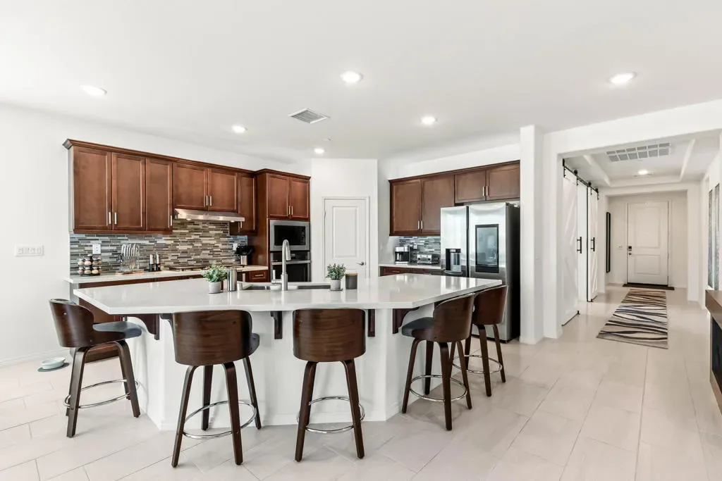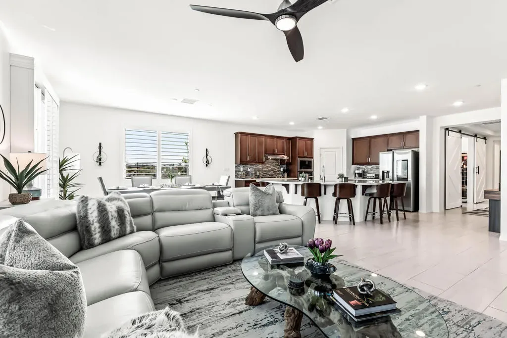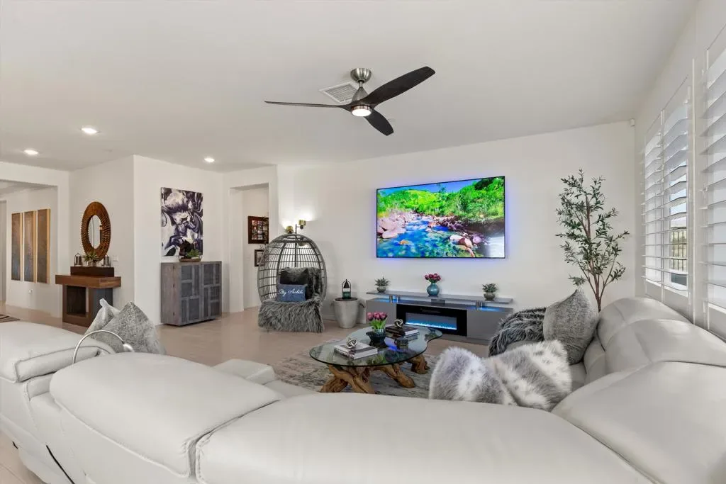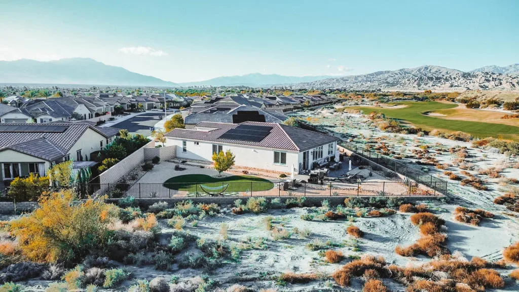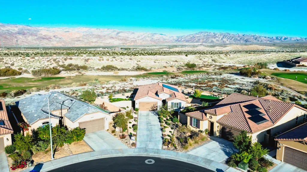 Welcome to this impeccably maintained 2023-built home offering 2,026 square feet of bright, open living in one of the Coachella Valley’s most desirable 55+ communities. Perfectly positioned on an oversized 13,068 sq ft premium lot – one of the most unique the community has to offer – this residence showcases sweeping golf course views and breathtaking 360-degree mountain vistas.The thoughtfully designed floor plan features 2 bedrooms, 2 bathrooms, and a generous den/office–ideal for a home workspace or hobby room. Soaring 9-foot ceilings and an open-concept layout create an inviting atmosphere, enhanced by porcelain tile flooring and natural light throughout.The chef’s kitchen impresses with quartz countertops, a large center island, dual ovens, stainless steel appliances, and a walk-in pantry. The primary suite offers a custom-designed walk-in closet and a spa-inspired bathroom with modern finishes. Upgraded carpeting in bedrooms, 4-inch plantation shutters, and ceiling fans complete the refined interior.Step outside to professionally landscaped grounds featuring artificial turf, mature fruit trees, and drought-friendly desert plantings. There’s no shortage of parking with the expansive driveway and oversized three-bay garage that includes space for a golf cart & an EV charger.Exceptional energy efficiency comes standard with a FULLY OWNED solar system. Even better, the home is located within the Imperial Irrigation District (IID), offering significantly lower utility rates than neighboring areas. Four Seasons Terra Lago boasts an impressive 22,000 sq ft clubhouse featuring a state-of-the-art fitness center, full-service salon, yoga/aerobics studios, library, billiard room, ballroom, bistro, & both indoor & outdoor pools. Stay active with golf, tennis, pickleball, & countless organized activities that foster connection & community.Beyond the gates, the best of the Coachella Valley awaits. Easy I-10 freeway access puts you minutes from world-class dining, shopping, and entertainment. Catch a concert or sporting event at Acrisure Arena, try your luck at nearby casinos, or explore miles of scenic hiking trails in the surrounding desert mountains. The vibrant communities of La Quinta, Palm Desert, & Palm Springs are all a short drive away–offering championship golf courses, boutique shopping on El Paseo, the Palm Springs Aerial Tramway, and the valley’s renowned restaurant scene.Turn-key and move-in ready–no new construction wait required.