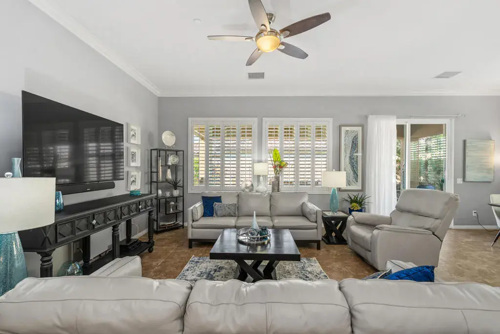Welcome to a home where effortless living and meticulous attention to detail create a true desert sanctuary. From the moment you arrive, the curb appeal sets the tone: a beautiful treed canopy frames the property, shading a hybrid desert-scape accented with lush artificial turf and thoughtfully curated plantings.Step through the custom front door and feel the warmth and refinement unfold seamlessly. This 2 bedroom + den (easily converted to a third bedroom), 2 bath home spans 1,910 sq. ft. and has been crafted with care in every corner. Tile flooring guides you throughout the home, while high ceilings, crown molding, and plantation shutters throughout enhance the space and sophistication. Soft, calming colors wrap each room in a welcoming embrace.The great room is the heart of the home — intimate enough for quiet evenings, yet generous enough for entertaining. The kitchen is perfectly designed for everyday living and gatherings alike, featuring abundant cabinetry, spacious countertops, a large walk-in pantry, and an oversized island where friends and family naturally gather.Step outside and the feeling of serenity continues. An oversized covered patio overlooks the lush, private backyard, where the gentle pitter-patter of a tranquil fountain reminds you that life is good and peace is here.Off a short hallway, the primary bedroom is a perfect place to unwind and recharge, with a bath boasting dual vanities, a separate shower and soaking tub, and a large walk-in closet.With plenty of storage, including an additional room for your private treasures or perhaps a crafting place and the 2 car attached garage, you can elevate your comfort, ease and livability, life here is simple, enjoyable and feels complete the moment you arrive.Located in the vibrant 55+ community of Four Seasons at Terra Lago, residents enjoy a large clubhouse, fitness center, indoor and outdoor pools, library, bocce ball, tennis, and a variety of clubs and activities. Just minutes from dining, shopping, and Fantasy Springs & Spotlight 29 Casinos, this home blends comfort, convenience, and the best of desert living.
