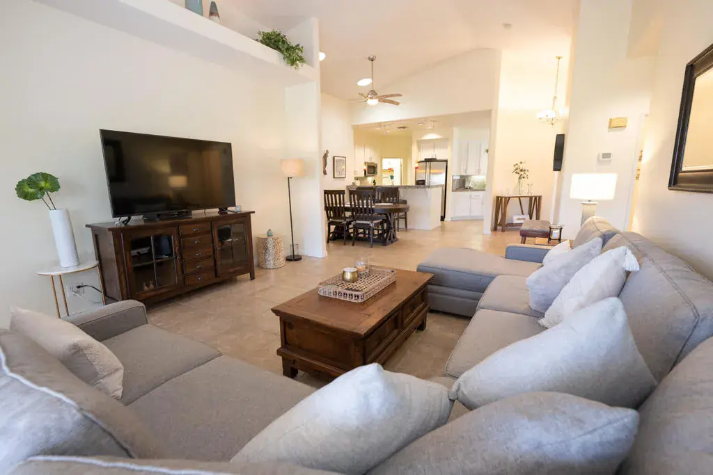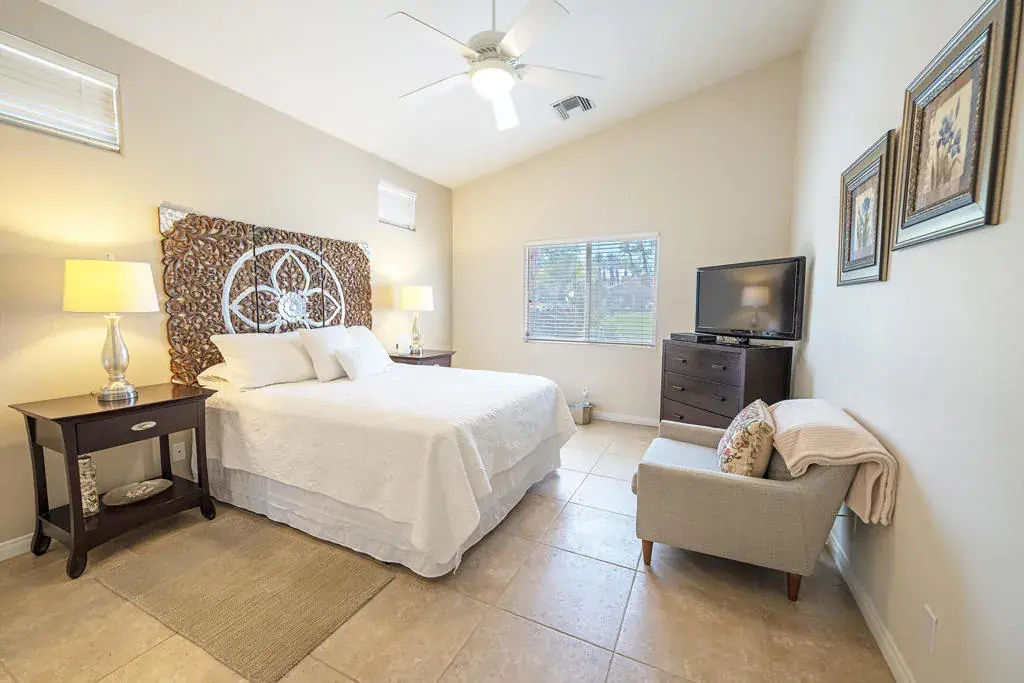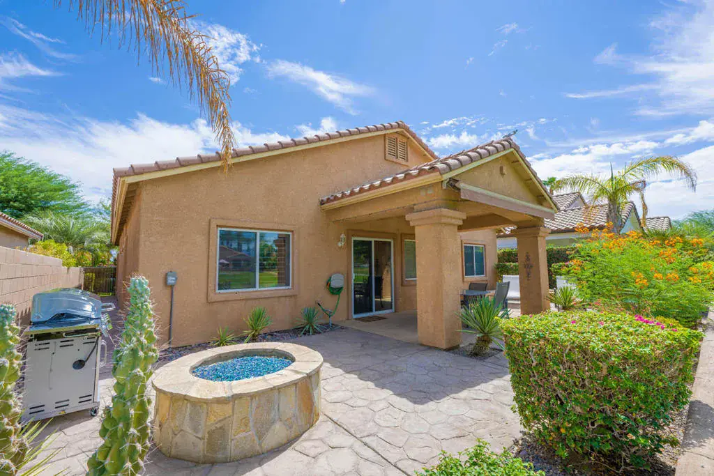 Available December 2025 – April 2026 for 30 days or longer! Super cute & clean designer furnished fairway home with 2 master suites & 2.5 baths. The kitchen offers stainless steel appliances, granite counter tops & abundant cupboard/counter space and breakfast nook. You will love the outdoor living space featuing an extended covered patio, a built-in fire pit for the cool nights, and a misting & awning system for the hot days. This home and patio all enjoy an incredible golf course view on an elevated home site looking onto the 3rd tee of the Indian Springs Golf Course. Just bring your toothbrush & golf clubs and you are set to enjoy an amazing desert lifestyle this winter! Rent/HOA includes landscape maintenance, 24 hr staffed entry, cable TV/internet, community pool, spa & fitness center. Please view 3D Virtual Tour and call for details, deposits and fees! Available December 2025 – April 2026 – NO PETS