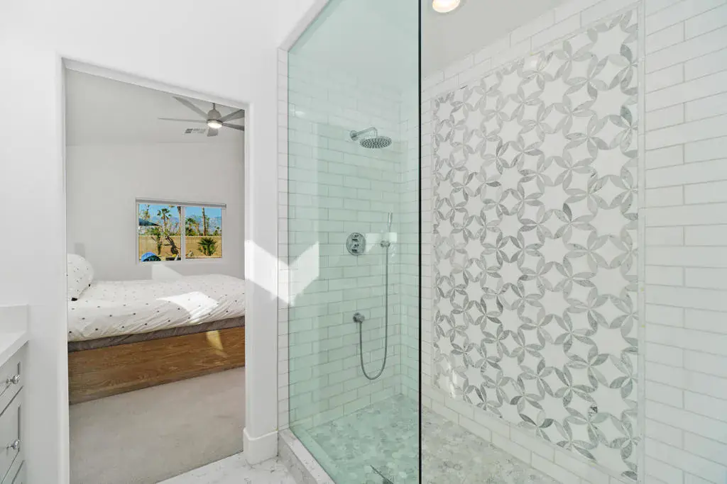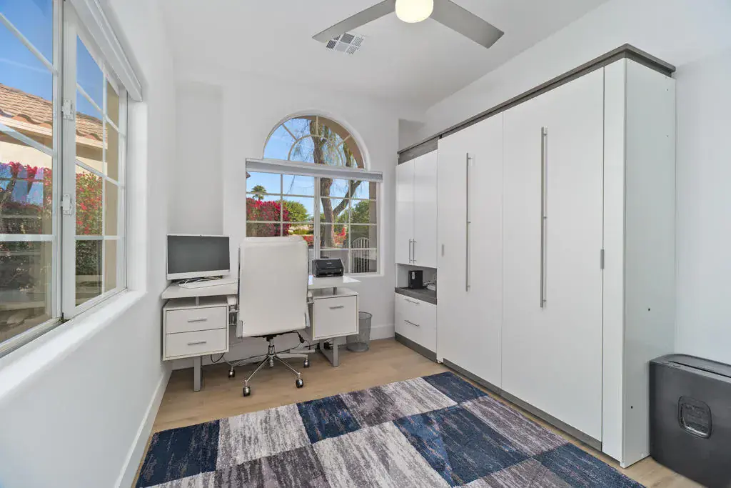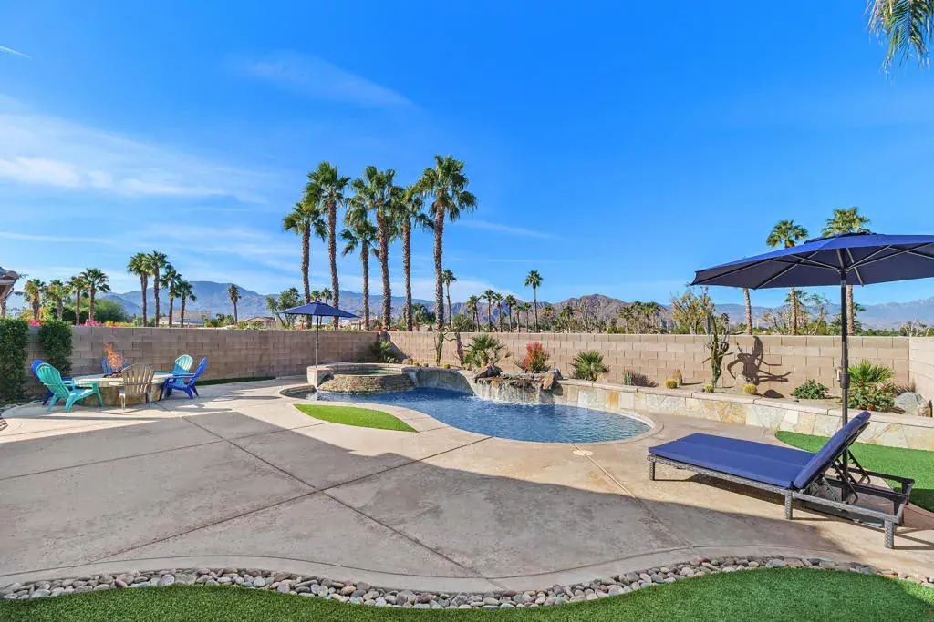 STUNNING QUALITY REMODEL! Back on the market after a summer hiatus. Discover luxury living in this beautifully renovated Balboa model home featuring 3 bedrooms (two primary bedroom suites) and 3 baths. Breathtaking mountain views from the west facing backyard with expansive private patio, pool, spa with rock waterfall, built-in BBQ, firepit, and shaded outdoor living space with fans & automatic sunshades – perfect for entertaining! Inside, enjoy a modern open-concept floor plan with high ceilings and wood-like tile flooring in the main living areas. The gourmet kitchen boasts sleek contemporary cabinets, Thermador appliances, quartz countertops, a full backsplash, and a walk-in pantry. The living room features a resurfaced floor-to-ceiling gas fireplace, while the dining area includes a picture rail for your favorite artwork. The first primary suite offers a large walk-in closet and a spa-like en-suite bathroom with a custom-tiled oversized shower. The second primary suite includes two large closets and a tub/shower with tile surround. The home also features a Murphy bed in the office/third bedroom, whole-house water filtration, an epoxy-floor garage with storage, and an insulated garage door. Located in the gated Indian Springs Golf Club, enjoy low HOA dues ($385/month) covering guard-gated security, front yard maintenance, cable/internet, a fitness center, lap pool, and more. Close to top-rated schools, premier shopping, dining, and the Indian Wells Tennis Center! Don’t miss this fully upgraded, move-in ready home in a prime location!