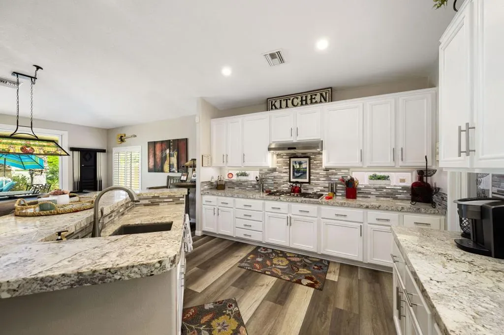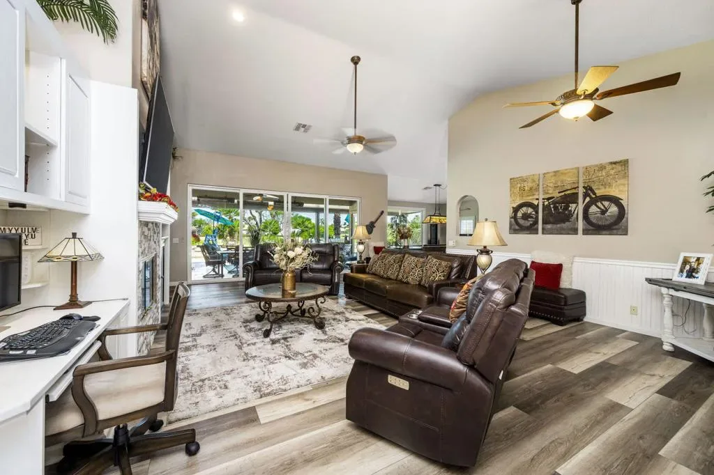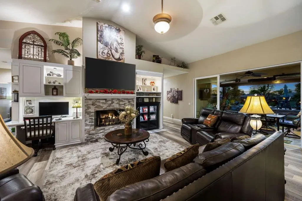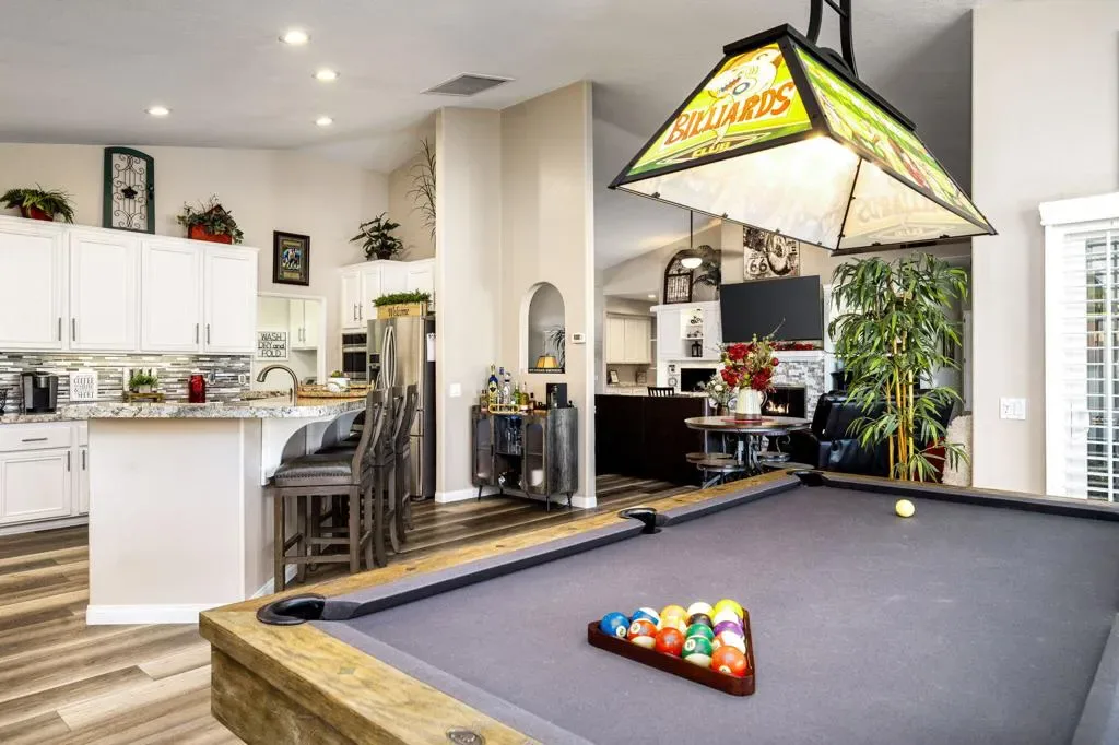 If you’re searching for ‘The Best of Indian Springs,’ you’ve just found it! Designed for exceptional indoor-outdoor living and effortless entertaining, this stunning residence offers 2,719 square feet, 4 bedrooms, 3 bathrooms, and a spacious 3-car garage–highlighted by one of the largest and most impressive resort-style backyards in the community.From the moment you enter, you’re welcomed by beautiful luxury vinyl flooring and an expansive great room that seamlessly blends comfort and style. Oversized, upgraded double sliding glass doors open wide to a truly spectacular covered patio–creating the perfect flow between indoor and outdoor living.The open-concept kitchen is built to impress, featuring a large center island, slab granite countertops, stainless steel appliances, and an oversized walk-in pantry. It connects effortlessly to the dining area, complete with a versatile dining/pool table–ideal for entertaining guests or enjoying memorable gatherings.Step outside and experience what truly sets this home apart. The backyard is a private resort–offering more functional living space outdoors than inside. Enjoy a custom PebbleTec pool with beach entry, play ledge, swim-up stools, cascading waterfall, and an elevated spa with its own observation deck–perfect for relaxing evenings under the desert sky.Multiple outdoor living areas invite you to unwind, including an oversized fire feature lounge, tranquil water features, and a fully equipped covered patio with built-in BBQ, dining area, infrared heaters, and a large-screen TV–creating the ultimate year-round entertainment space.The primary suite is a private retreat, generously sized with serene views of the pool and outdoor living areas. The spa-inspired bathroom and expansive custom walk-in closet complete a space designed for comfort and luxury. Three additional bedrooms are thoughtfully positioned at the front of the home, offering privacy and flexibility for family and guests.This is a rare opportunity to own one of Indian Springs’ most exceptional homes–meticulously upgraded, beautifully maintained, and designed to elevate everyday living.Come experience it in person–this one truly stands apart.