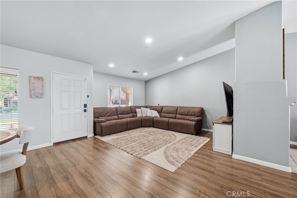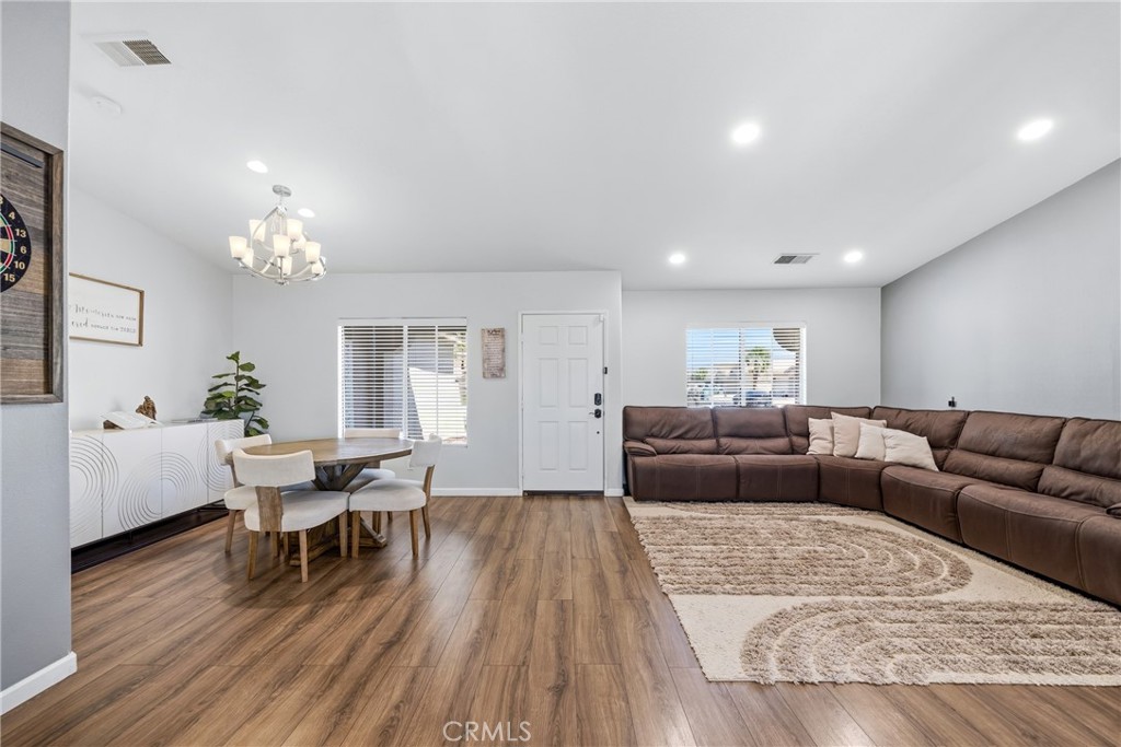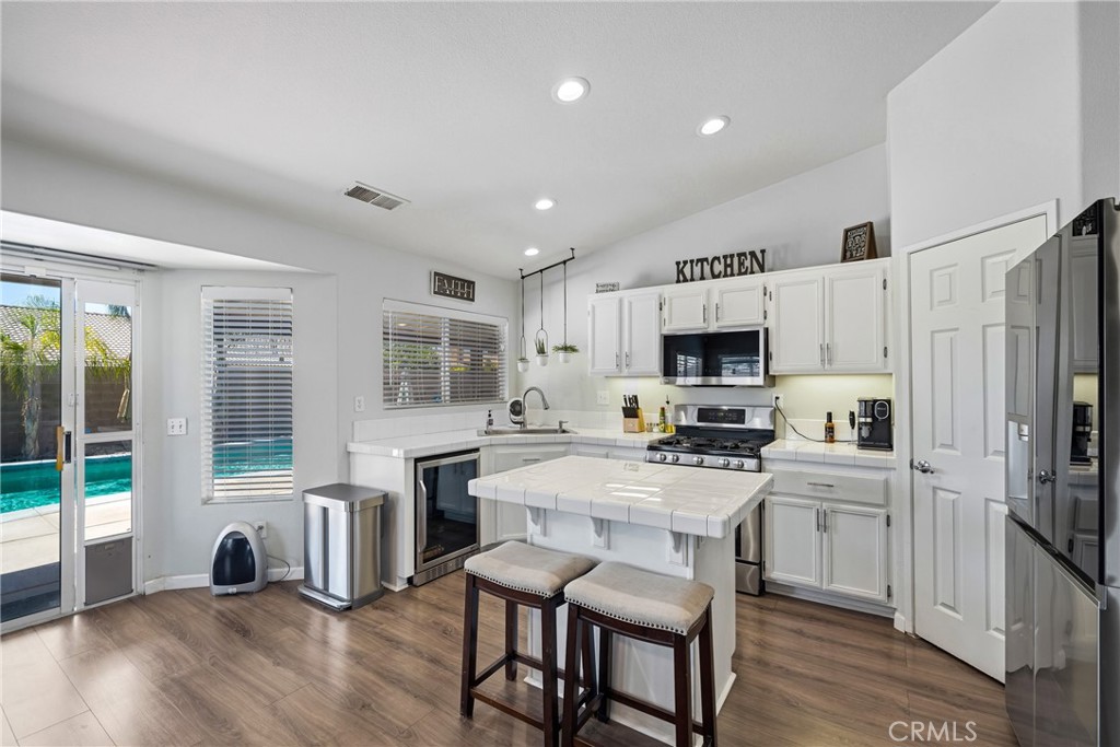 Step inside and be greeted by a bright and airy open-concept living room, featuring soaring vaulted ceilings, rich wood-look flooring, and a neutral color palette that creates a fresh and inviting atmosphere. The spacious living area flows seamlessly into the kitchen, which is truly the heart of the home. Boasting crisp white cabinetry, sleek countertops, stainless steel appliances, and an island with bar seating, it’s a space designed for gathering. A cozy fireplace and a separate dining area provide ample room for both intimate dinners and festive celebrations.
