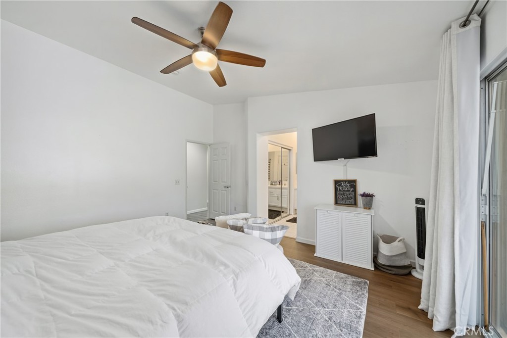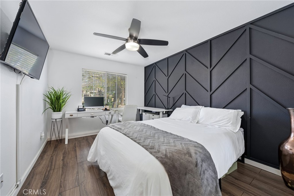 The home’s thoughtful design extends to the private quarters. The primary suite is a true retreat, featuring a stunning, hand-painted mountain mural that evokes a sense of tranquility. Best of all, it offers direct sliding-door access to the backyard, allowing you to wake up and step right into your personal paradise. The additional bedrooms are equally stylish, with one showcasing a dramatic geometric accent wall, offering comfortable and chic spaces for all.