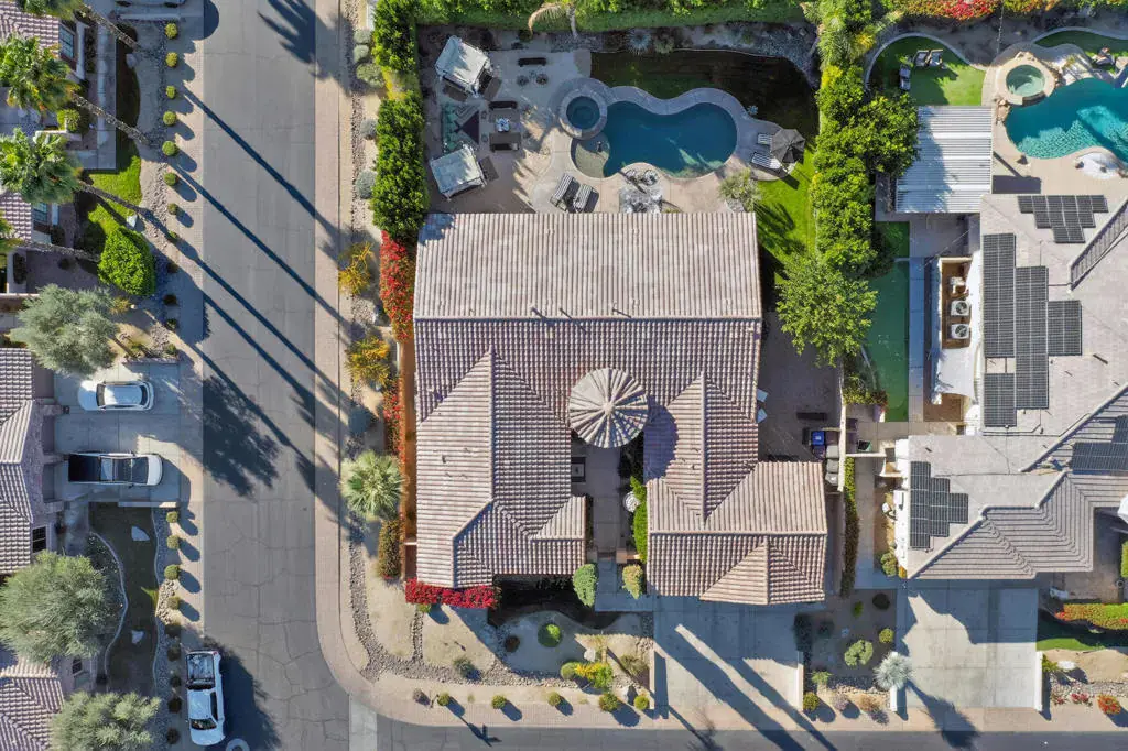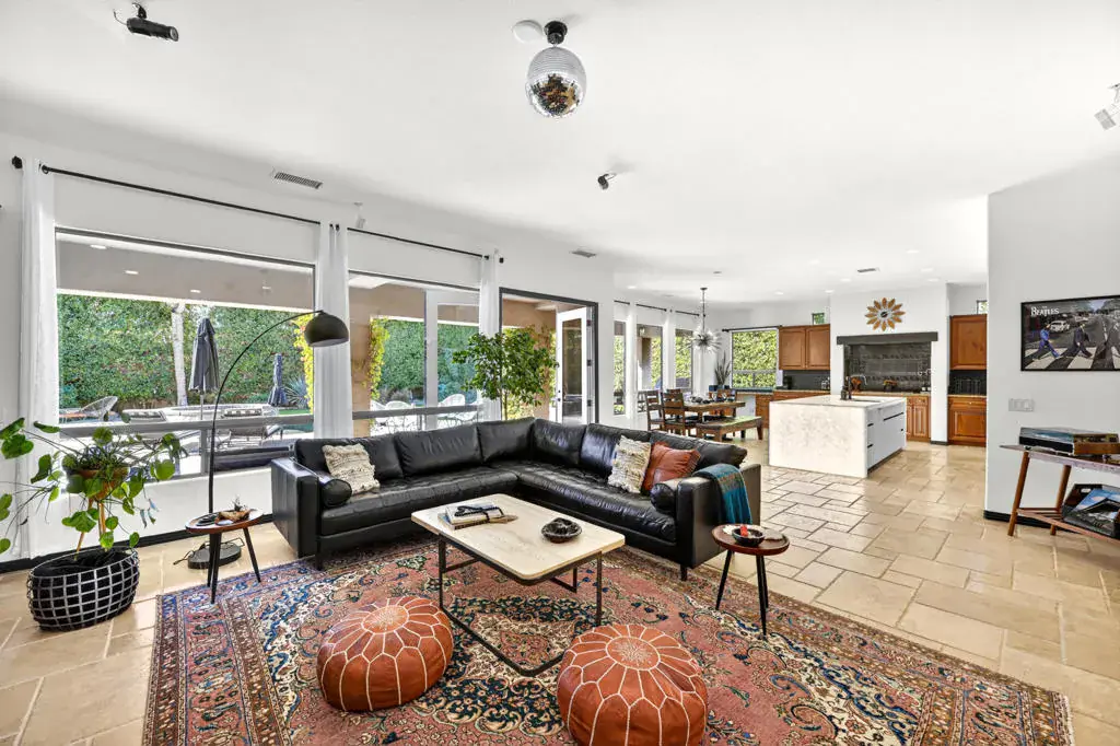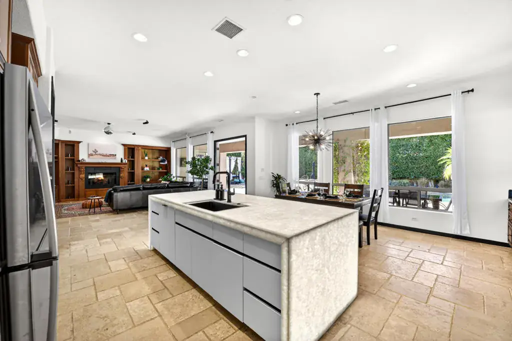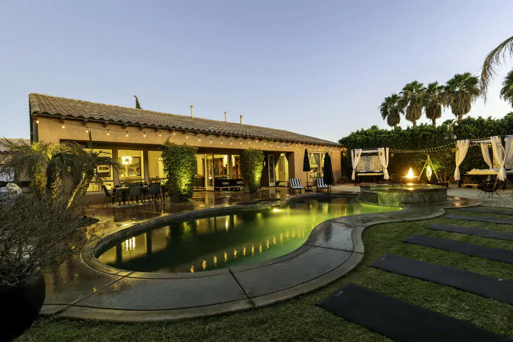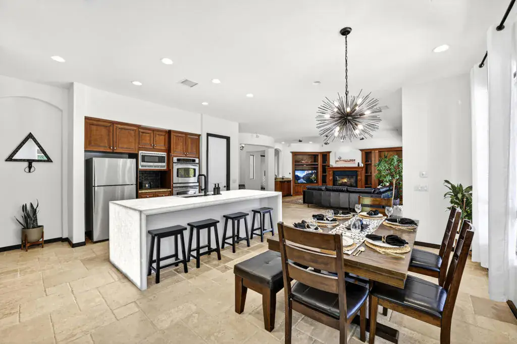 Welcome to Montage at Santa Rosa, a STR friendly development, where refined desert living meets resort-style comfort! This expansive 5-bedroom, 3.5-bath residence offers 3,308 square feet of thoughtfully designed living space, perfectly situated on an impressive 16,117 square foot lot and offered turnkey furnished–ideal for effortless personal enjoyment or immediate rental use. Designed for both everyday living and grand-scale entertaining, the open-concept layout features light-filled living spaces, soaring ceilings, and seamless indoor-outdoor flow. The chef’s kitchen anchors the home with a large marble LED island with white wood cabinets and Thermador panel dishwasher, generous cabinetry, and ample prep space–perfect for hosting gatherings or accommodating guests. Step outside to a private backyard retreat reminiscent of a boutique resort. The beautifully landscaped grounds showcase a sparkling pool and spa, multiple lounge and entertaining areas, and ample space to relax under the desert sky–creating a true vacation-style experience year-round. With five well-appointed bedrooms, the home offers exceptional flexibility for guests, multi-generational living, or work-from-home needs. Located close to world-class golf, dining, shopping, and festival venues, this property is exceptionally well-suited as a primary residence, luxury vacation home, or income-producing short-term rental investment. Additional updates include a pool heater and motor replaced in April 2025, HVAC units replaced in July 2025, the interior of the house, garage door and trim painted in August 2024. Space, style, and STR flexibility–this is desert living at its best.