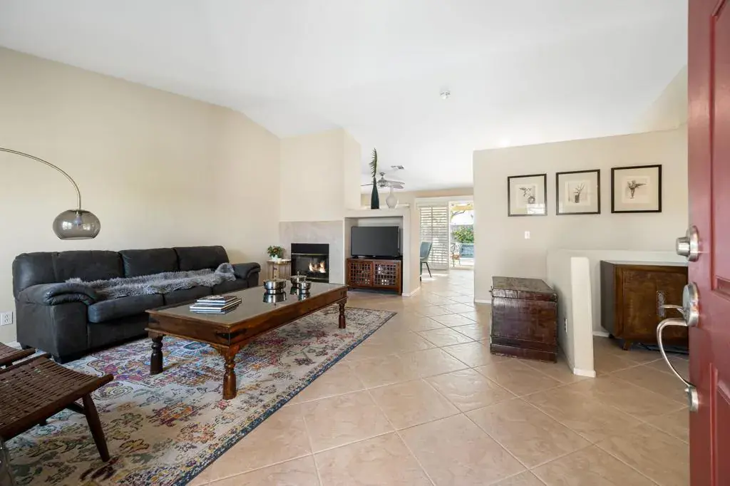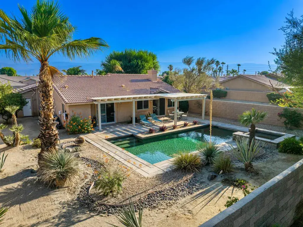 The ultimate in desert living begins here within the gates of Monticello ll in Indio. This beautifully maintained home features 3 bedrooms including primary suite, 2 baths, dining area, light and bright kitchen with Morning Room and South-facing entertainment patio. The large, custom-designedpool with spa and spillway is perfectly positioned to enjoy the view of the distant Mountains and palm trees that surround the area. Upgrades withinthe home include 18-inch diagonal ceramic floor tile, Plantation Shutter Doors in kitchen and primary, custom blinds, granite countertops andstainless appliances. A newer heat pump and AC system offers comfort and efficiency, plus an attic fan that activates during extreme heat to assistin whole-home cooling and lowering power usage. Pride of ownership is evident throughout this 1,500 sq. ft. home that boasts style, comfort, functionality and resort style living.