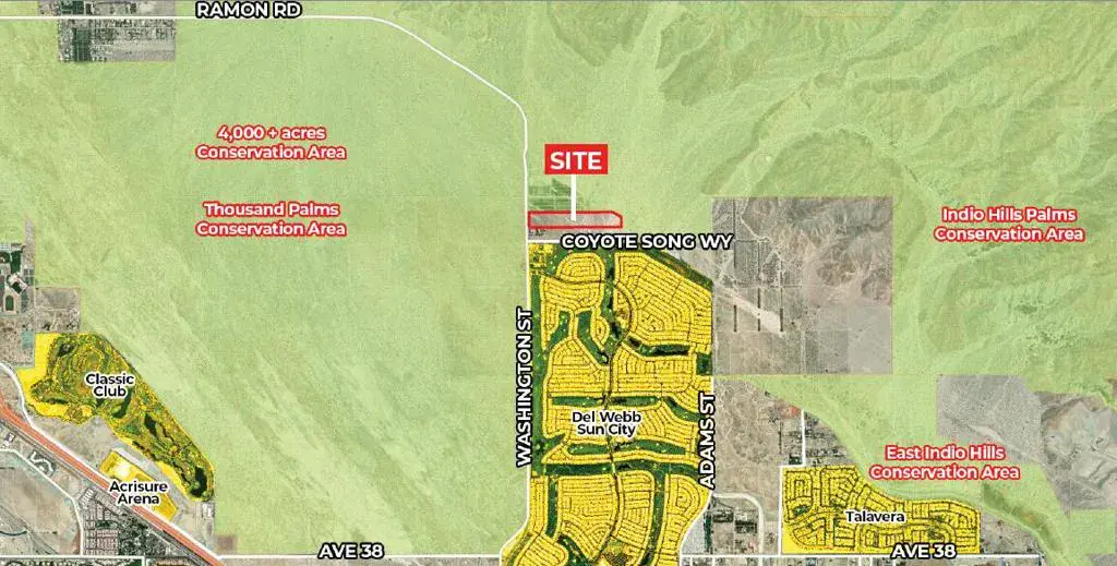■ Prime location for a high-end luxury estate development■ Zoned Desert Estate – allows for 1 acre estate lots■ Adjacent to Del Webb Sun City, a prestigious 55+ gated community with 5,000 homes and a 36 hole golf course■ Surrounded by over 4,000 acres of conservation land, ensuring privacy and natural beauty■ Just minutes from Interstate 10, convenient shopping and fine dining■ Spectacular panoramic views of the entire Coachella Valley