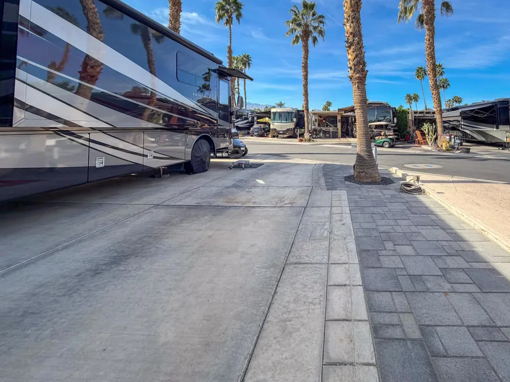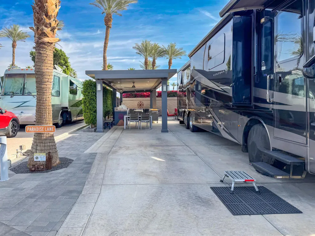 Lot 106 at Outdoor Resort Indio offers a quiet, private setting with thoughtful upgrades and comfortable outdoor living just down the street from the clubhouse. A newer Alumawood pergola with an insulated solid roof spans the full allowable length and includes two ceiling fans and two two-stage ceiling heaters, creating an inviting space for relaxing or entertaining.The medium outdoor kitchen features a stainless BBQ, under-counter refrigerator, water heater, two-burner cooktop, and practical functionality for everyday use. The living area is centered around a mobile TV Televator cabinet with fireplace and comes fully furnished with a sofa, two chairs, two ottomans, coffee table, and coordinating cushions, plus a fire pit table with four chairs. An outdoor dining table with four chairs and a cushioned bench, outdoor rug, and five storage bins complete the setup.Additional highlights include pavers extending the lot to the side and rear, metal art screens around the hookup post, a metal privacy screen between lots, a 100-amp electrical panel, and furniture covers. This property has been surveyed, offering added peace of mind. Well located and move-in ready, Lot 106 is an excellent opportunity for Class A motorcoach living at ORI.Outdoor Resort Indio is a Class A only RV resort