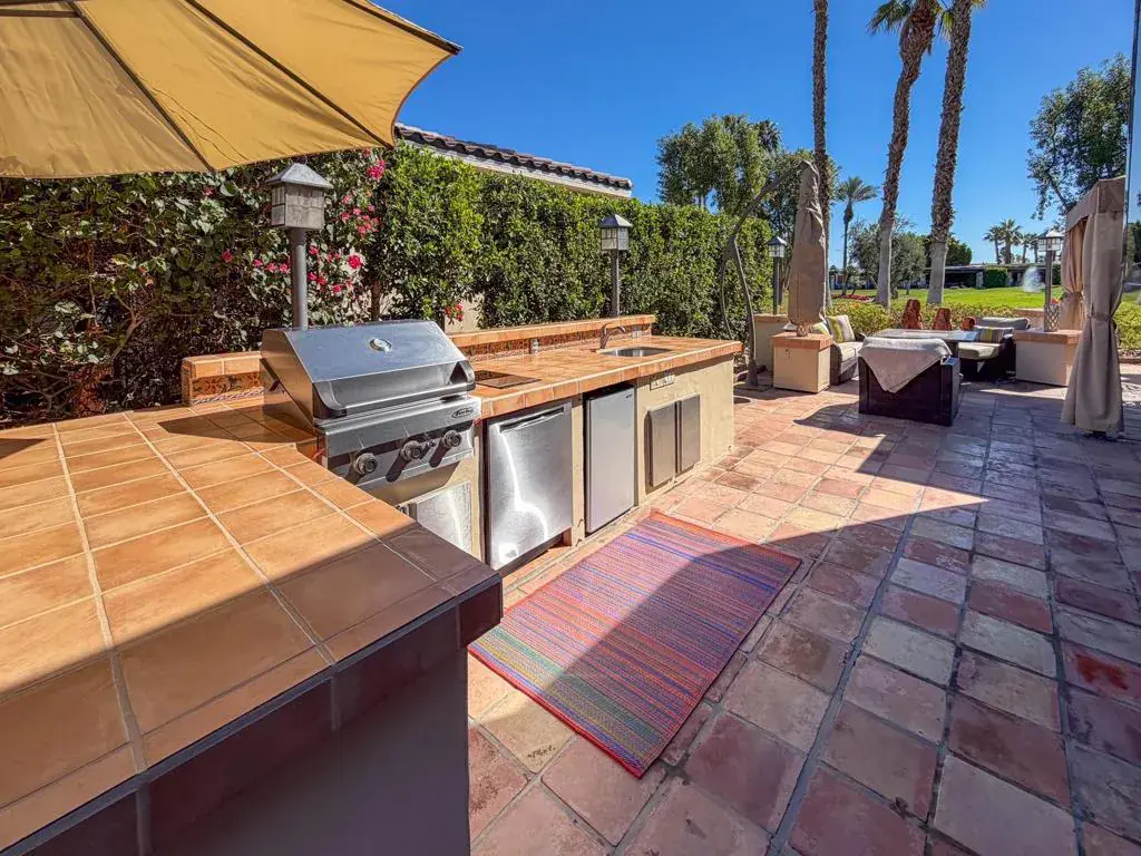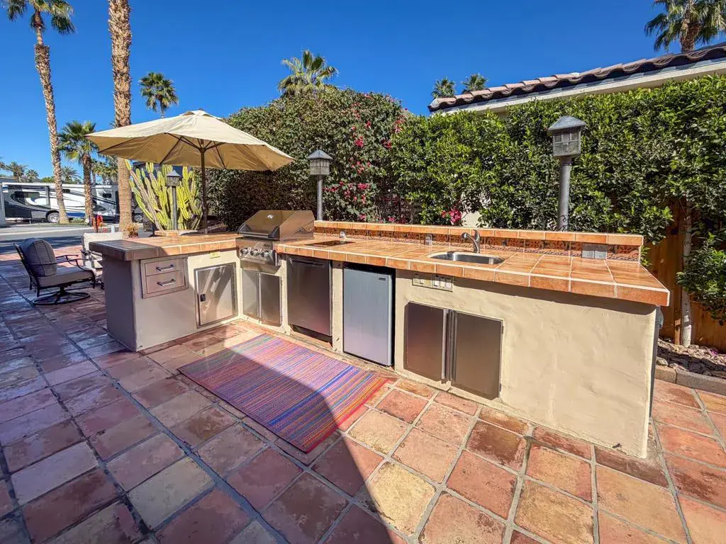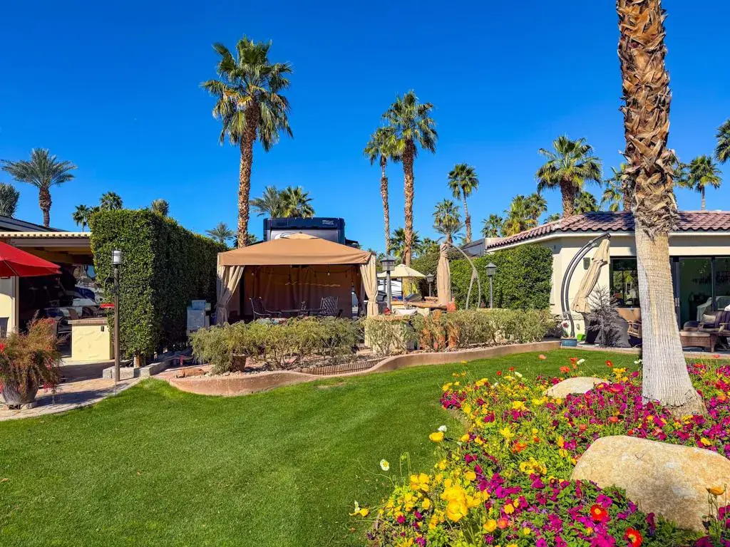 Outdoor Resort Indio is a Class A Motorcoach resort. This is an RV lot. Lot 226 at Outdoor Resort Indio is a private, golf course-view RV lot offering a comfortable and inviting outdoor living setup in a quiet yet highly central resort location. The RV pad is finished with classic Saltillo tile, and the medium-sized outdoor kitchen features tile countertops, refrigerator, dishwasher, two-burner electric cooktop, BBQ grill, oven, garbage disposal, hot water, custom kitchen covers, and a cantilever umbrella for added shade.The lot is well arranged for relaxing or entertaining, with multiple seating areas including a zip-up gazebo, a fire table with four chairs at the front, a second fire table with loveseat, ottoman, and two chairs, a high-top table with two chairs, and a full outdoor dining table with seating for six. Thoughtful landscaping enhances privacy, while the eastern-facing back of the lot provides beautiful morning light, peaceful golf course views, and excellent afternoon shade–perfect for enjoying coffee or unwinding at the end of the day.Conveniently located within walking distance to the clubhouse and resort amenities, this lot offers the rare combination of being at the heart of resort activity while remaining quiet and private. This a great opportunity to enjoy relaxed golf course living at Outdoor Resort Indio.