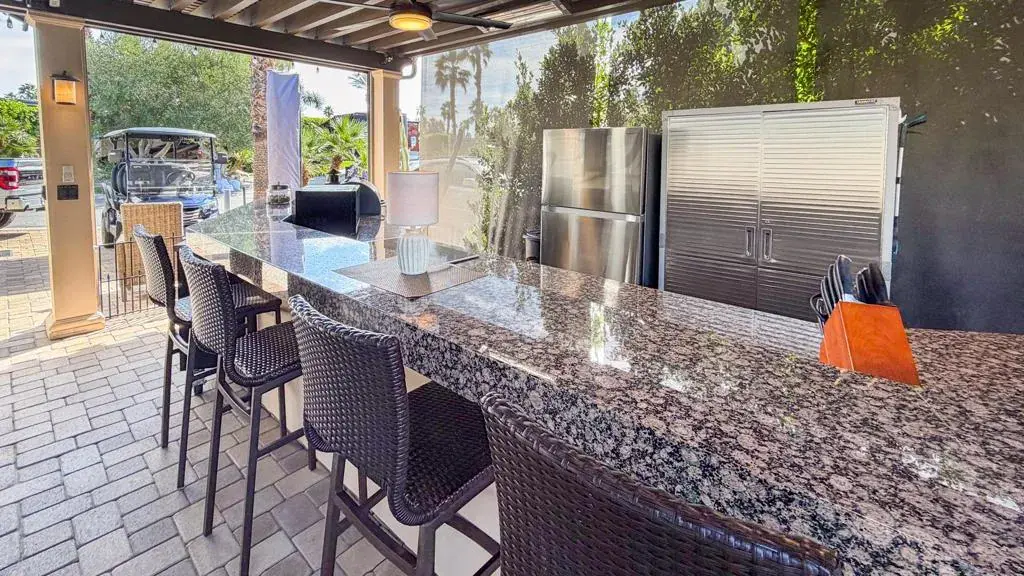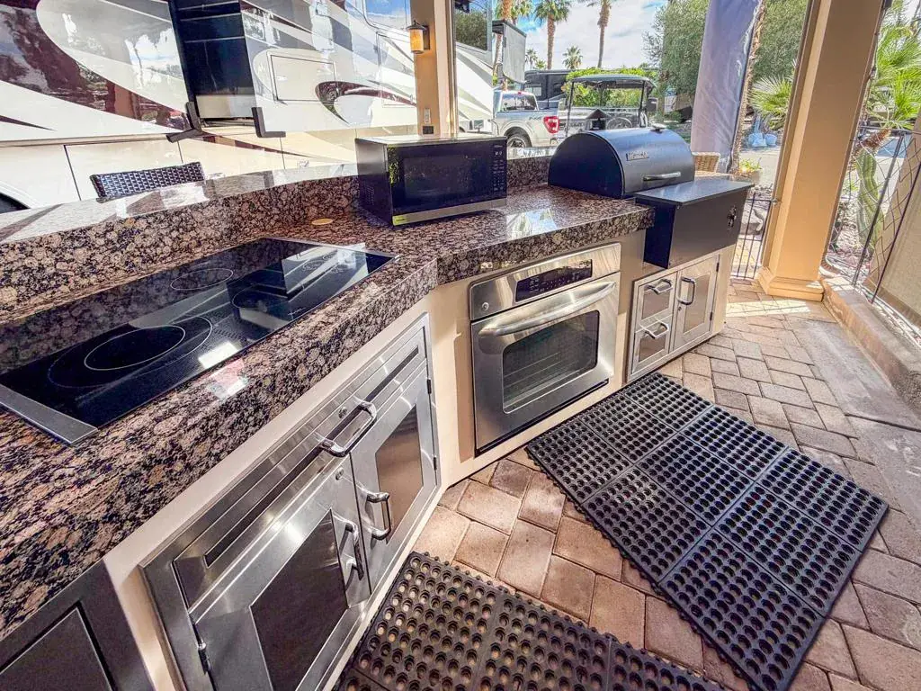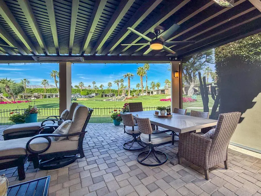 Welcome to Lot 294 at Outdoor Resort Indio, a beautifully upgraded entertainer’s lot with stunning mountain, lake, waterfall, bridge, and golf course views.The spacious L-shaped pergola features an insulated solid roof, six radiant heaters, and four ceiling fans, with six electric screens to fully enclose the back and additional screens surrounding the kitchen area. An outdoor entertainment center with a large TV, protective rolling door, and fireplace readiness creates the perfect gathering space.The oversized kitchen showcases granite countertops, a built-in Traeger smoker, four-burner cooktop, oven, dishwasher, under-counter refrigerator, full-size refrigerator, and extensive custom storage. Pavers surround the lot, complemented by a six-year-old concrete RV pad, mid-lot water and sewer hookups, and two sewer connections.Offered furnished, the lot includes a large dining table for eight, a comfortable seating area with fire table, bar stools, storage cabinets, cantilever umbrella, and dog fencing. There is also room for a full-size truck and golf cart.Walking distance to the clubhouse, yet far enough away to maintain your privacy.Outdoor Resort Indio is a Class A RV only resort.