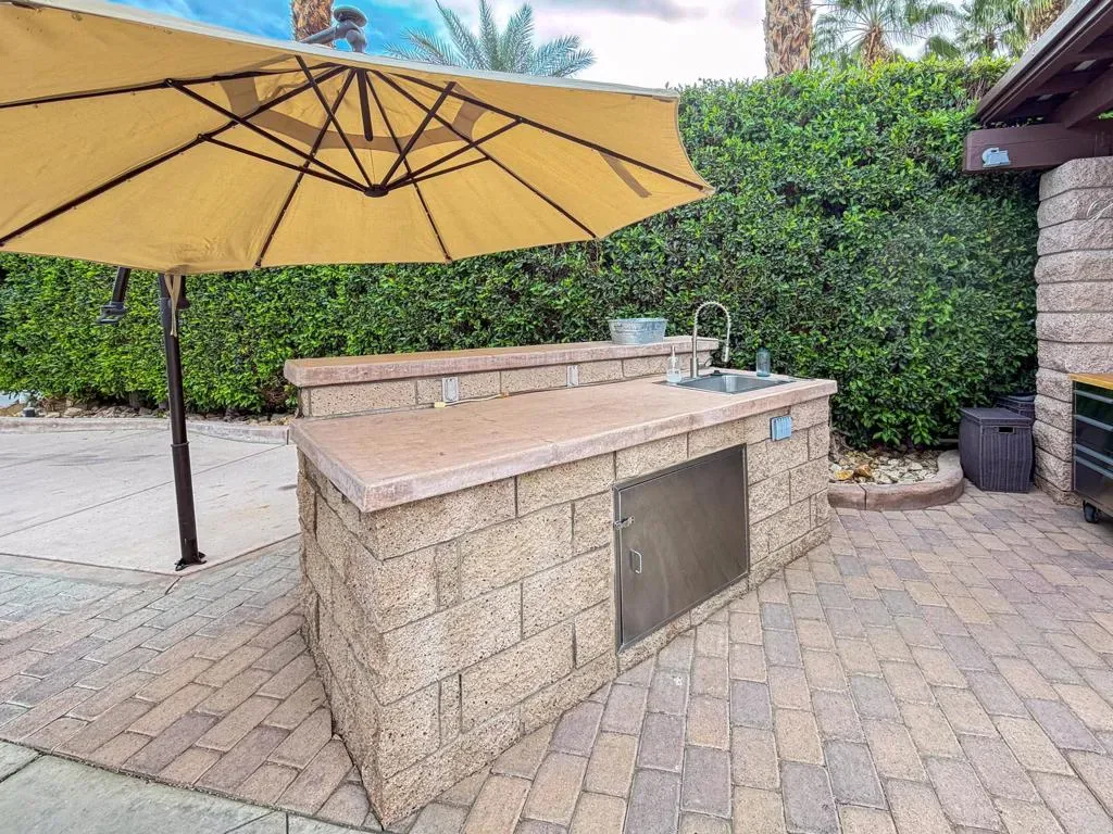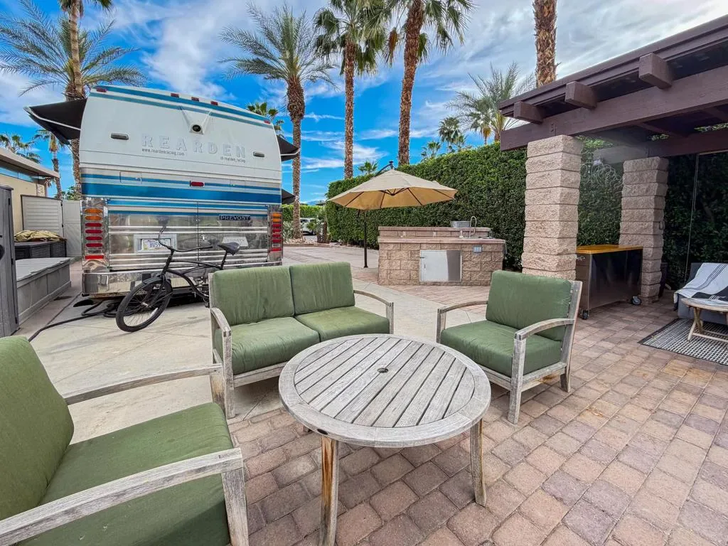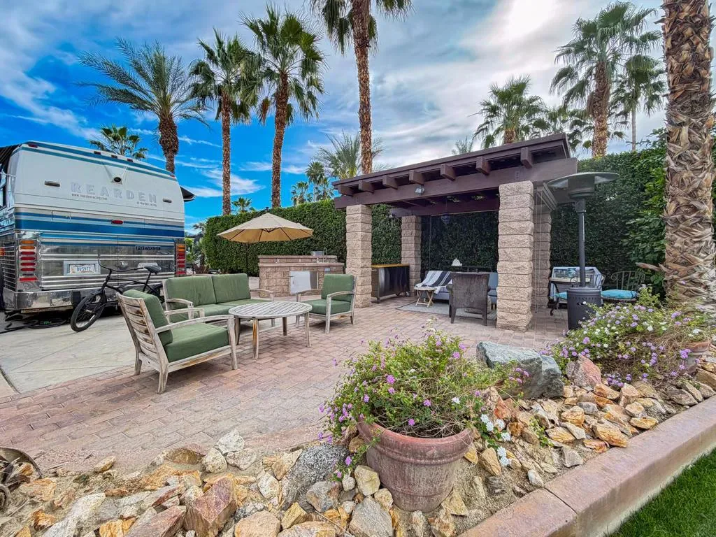 Positioned at the highest point of ORI, this exceptionally private lot is framed with mature hedges, six palm trees, and a citrus tree, creating a peaceful retreat with remarkable views. From the rear of the lot, you face north across the lake toward a large waterfall, with sweeping vistas of the Chocolate Mountains that glow beautifully at sunset — truly one of the most breathtaking backdrops in the resort.The outdoor living space includes a nicely maintained wood-top pergola with sheet metal roofing and two manual screens for shade and comfort. Pavers and a concrete RV pad provide both functionality and an inviting area to relax and entertain.A convenient simple kitchen counter area offers a sink, garbage disposal, hot water heater, and storage — perfect for easy outdoor meal prep. Outdoor Resort Indio is a Class Only RV resort.