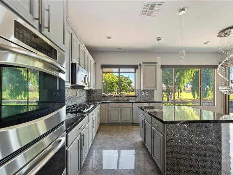 PRICE REDUCTION!!! Located within the prestigious Sun City Shadow Hills 55+ gated community, this stunning 2,966 sq. ft. La Paz model–the largest floorplan in the community–offers exceptional luxury, space, and upgrades, including a private CASITA with a 3/4 bath.Ideally situated on the golf course with serene pond VIEWS, the private backyard is a true resort-style retreat featuring a large POOL with dual sheer descents, a raised SPA with stone tile spillover, vibrant fruit trees, and a built-in BBQ peninsula with bar seating. Breathtaking mountain views provide the perfect backdrop for relaxing or entertaining.Through elegant custom glass entry doors, the home opens to a spacious, open-concept layout with pristine large-format tile flooring throughout the main living areas. The living room features recessed ceiling speakers, a gas fireplace, a built-in dry bar, and dual picture windows overlooking the backyard.The spectacular kitchen is a chef’s dream, showcasing stone countertops, a center island, stainless steel appliances, designer lighting, a walk-in pantry with custom shelving and glass door, and a butler’s pantry with extensive cabinetry. The formal dining room is accented by a chic chandelier, while the private office/den with dual glass doors offers an ideal space for work or quiet retreat.The luxurious primary suite includes direct patio access, a walk-in closet with custom built-ins, and an expansive spa-inspired bathroom featuring a soaking tub, dual vanities, and an oversized natural-stone shower.Additional highlights include a spacious laundry room with sink and storage, and a massive three-car garage equipped with extensive built-in cabinetry.Sun City Shadow Hills offers 24-hour guard-gated, resort-style living with two golf courses, two clubhouses, two fitness centers, three pools, tennis, pickleball and bocce courts, four dog parks, and over 60 social clubs–all in the heart of the Coachella Valley.This exceptional home is truly one of the finest properties in the community, offering luxury living, unmatched views, and outstanding value.