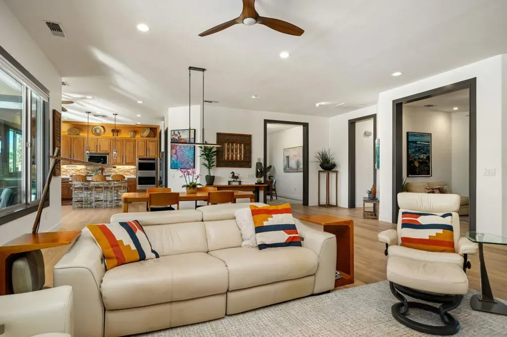 Singular refers to something extraordinary, remarkable, or unique. The Pointe exemplifies these qualities, offering an unparalleled living experience within a community of nearly 3,500 homes. Situated on a 16,553/sf peninsula bordered by a lake and 219 linear feet of golf course; the estate boasts panoramic views of the Santa Rosa, San Gregorio, and Chocolate Mountains. This property has been completely remodeled and updated, featuring three ensuite bedrooms, including a casita, to provide ample accommodation for family and guests with private spaces. The estate enjoys exceptional privacy, with no visible neighbors on either side of the property. The gourmet kitchen is equipped with a butler’s pantry, walk-in pantry, quartz countertops, stacked stone finishes, and a suite of new KitchenAid appliances. The owner’s suite includes a custom built-in window lounge, soaking tub, and luxury shower, all designed to maximize the scenic vistas.Entertainment options are extensive; residents can enjoy privacy in the pool and spa, relax on the second-level deck beneath a wraparound pergola, observe the golf course, or appreciate stunning desert sunsets. The owned solar panel system and Tesla Powerwall support efficient energy management with an average monthly utility cost of $135. Additional amenities include a three-car garage and driveway parking for six vehicles, facilitating large gatherings and events with ease.Sun City Shadow Hills residents enjoy access to two expansive clubhouses, each equipped with state-of-the-art fitness centers, indoor and outdoor pools, relaxing spas, and a robust calendar of classes and events. The community features two meticulously maintained championship golf courses, one recently ranked #4 in the Nation, as well as courts for tennis and pickleball and resident participation in over 50 different social clubs. A list of all upgrades and features is available. No open houses held for this listing. To view the property in person an appointment is required.