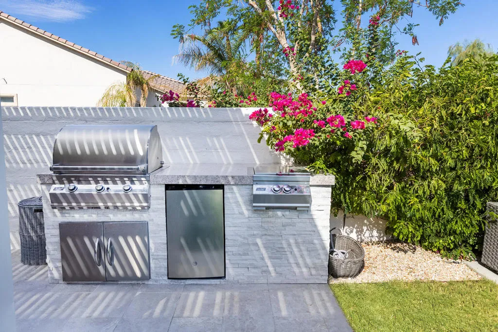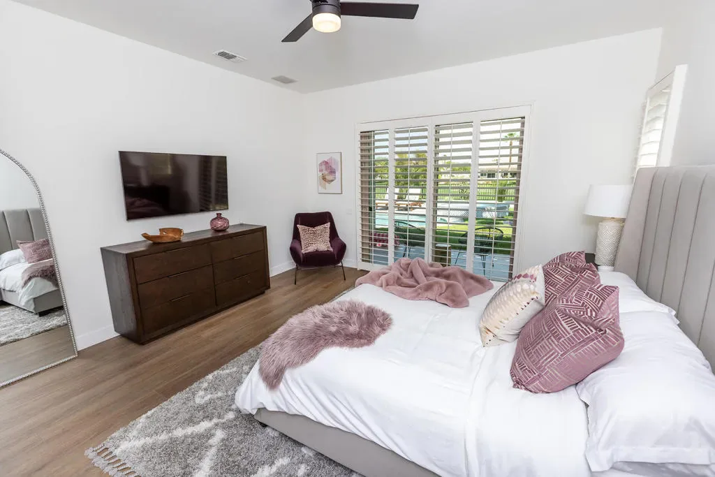 Available May- Dec for $5500.00 Ultimate desert resort style living. Located in guard gated Sun City Shadow Hills featuring the highly desirable San Rafael floor plan and adjacent to an open area on one side of property for more privacy. This totally remodeled home includes resort like pool with spa, 3 spacious bedrooms plus a den for a possible 4th bedroom and 2.5 bathrooms. The entry leads to a large great room with picture windows & sliding door to the entertainer’s yard and is adjacent to the gourmet kitchen! Featuring quartzite countertops, white cabinets, all stainless steel appliances, built-in combination wall and microwave oven, refrigerator, and 5-burner gas cook top. LG steam washer & dryer in the laundry room with plenty of cabinet space & sink that leads to a 3 car garage with included golf cart. The beautiful master suite has sliding doors to the back yard with views of the pool and golf course, a large bathroom with freestanding soaking tub and separate shower and a large walk-in closet. Master has total privacy as the 2 guest suites are on the opposite side of the home and they share a Jack and Jill bath with walk-in shower. Experience outdoor living at its finest with a pool featuring a tanning shelf and an 8-foot spa. Entertain effortlessly with a built-in stainless steel BBQ and gather around the inviting gas fire pit, surrounded by a cozy, comfortable couch.