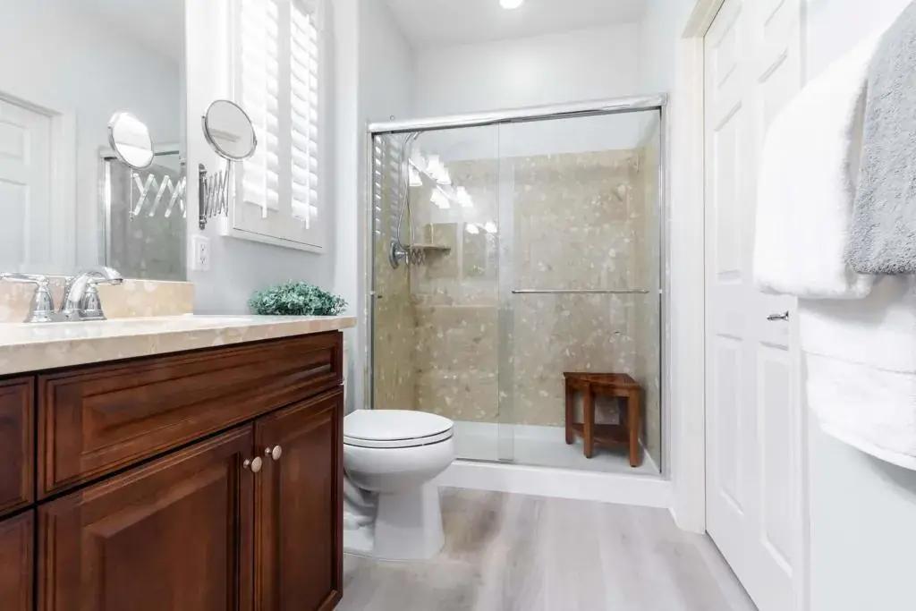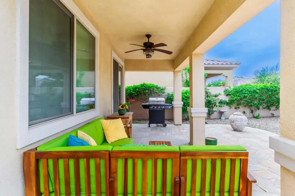Leased for January, February, and March 2027; available all other months. 55+ community. You will love every inch of this 1,295 SF (EST.) Cordoba plan with the ideal two bedroom and two bath layout. The kitchen, dining area and great room is one wide open area with tile flooring and views of the rear patio and beyond. The kitchen has granite countertops, stainless steel appliances framed by rich dark cabinets w/pulls and a stool height island with a wrap-around counter that is ideal for entertaining. The home has plantation shutters on the windows and lighted fans on soaring ceilings. The primary bedroom has carpet flooring, dual vanities, a glass enclosed shower and a huge walk-in closet. Across the home, near the front entrance, is the guest bedroom and the guest full bath that has a shower over the tub. The finished laundry room has cabinets above and below the folding counter, a deep utility sink & an upscale washer and dryer. The two car attached garage has a whole house water softener, an evaporative cooler, storage cabinets on the floor, storage racks on the ceiling and a man door leading to a side-yard. The patio has a flagstone finished deck that has been extended beyond the covered portion to enhance your outdoor living enjoyment! An exceptional home!