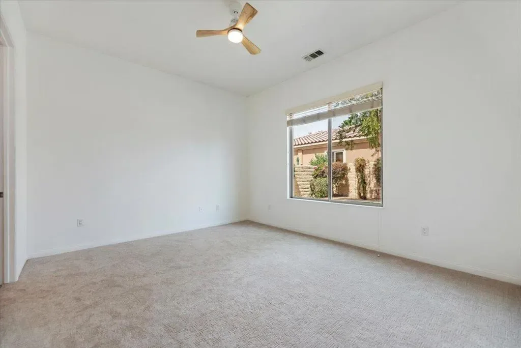 This well-maintained Canterra model with fresh paint and new carpet offers 1,257 sq. ft. of comfortable living on a desirable corner lot in the 55+ community of Sun City Shadow Hills. The open great room features tile flooring, abundant natural light, and sliding doors leading to a private backyard. The kitchen includes stainless steel appliances, granite countertops, and a cozy dining nook. The primary suite offers a walk-in closet and ensuite bath with dual vanities and a walk-in shower, while a guest bedroom and full bath provide space for visitors. Enjoy a private outdoor area with a covered patio and seating space perfect for relaxing. Offered as a long term rental. Come and get it before it’s gone!
