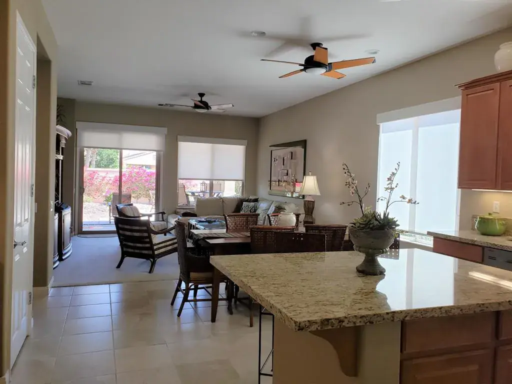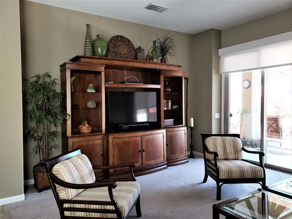 Indio, Sun City Shadow Hills- Serrente Model – Turnkey Furnished -ANNUAL LEASE TERM. This attractive 2 bedim 2 bath home features a Great Room with smart TV, Den with sleeper sofa. Beautiful kitchen w/granite slab counters, Refrigerator, Breakfast bar & Dining Area. Gas range, convection oven & Microwave. Primary Bedrum with king bed and TV. Attached private bath with dual sinks and walk-in shower. Guest Bedroom with queen bed, guest bath with shower/tub. Laundry room with washer & dryer. 2 Car attached garage. Covered patio with view of the Chocolate Mountains. Very well maintained . Sun City Shadow Hills is an active adult community offering two clubhouses with state of the art fitness centers, indoor/outdoor pools, bocce courts, billiards, lighted sports courts, two golf courses, restaurant plus numerous club and social activities. Age restricted community – occupants must be 55 yrs old. Owner will not remove furnishings. Call for details.