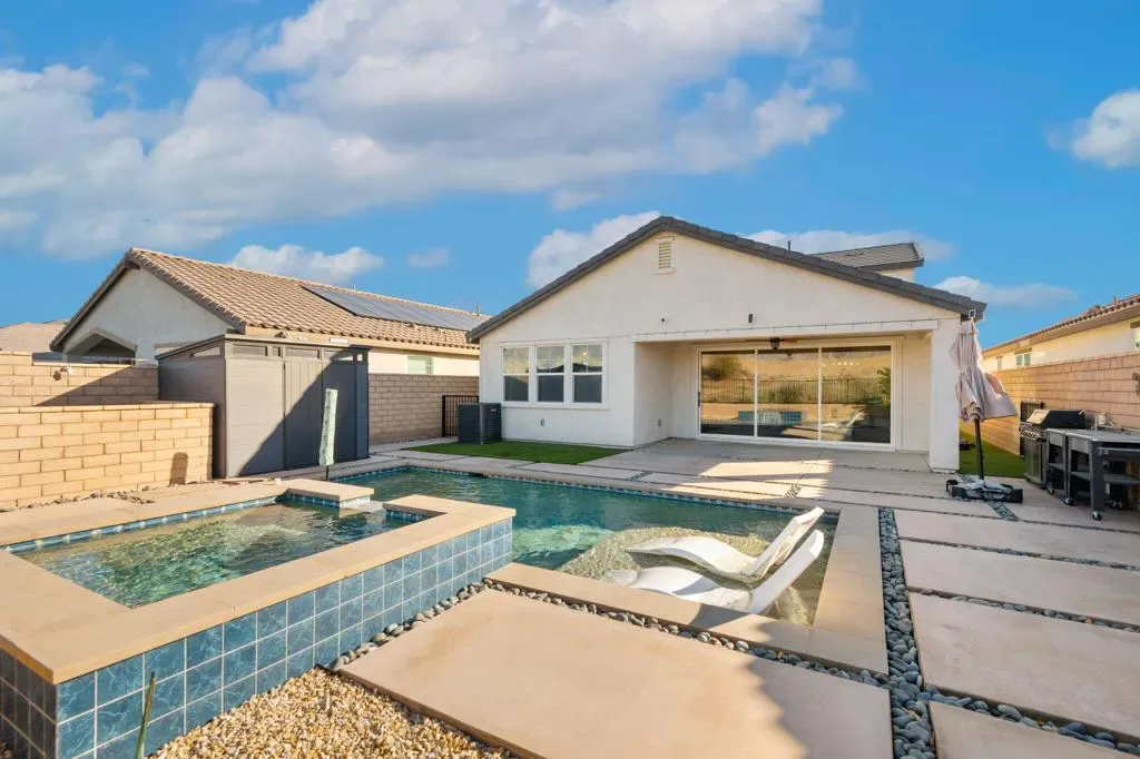 Beautiful move-in ready home in one of Indio’s most sought after gated communities! Built in 2023, this spacious, light and bright home offers seamless indoor/outdoor living with a collapsing wall of glass that opens to the resort style saltwater pool and expansive views. This home lives like a single story with a FIRST FLOOR PRIMARY SUITE! Boasting two iiadditional bedrooms, PLUS a dedicated OFFICE with Murphy bed and an upstairs LOFT area for even more flex space. There’s even a dog run! This beautifully upgraded property features money saving leased solar and an EV charger in the garage. As an added bonus, this home offers excellent potential as a short term rental investment (subject to HOA rules). Comfort, style and security all reside at 84112 Caviano Drive and now, you can too!