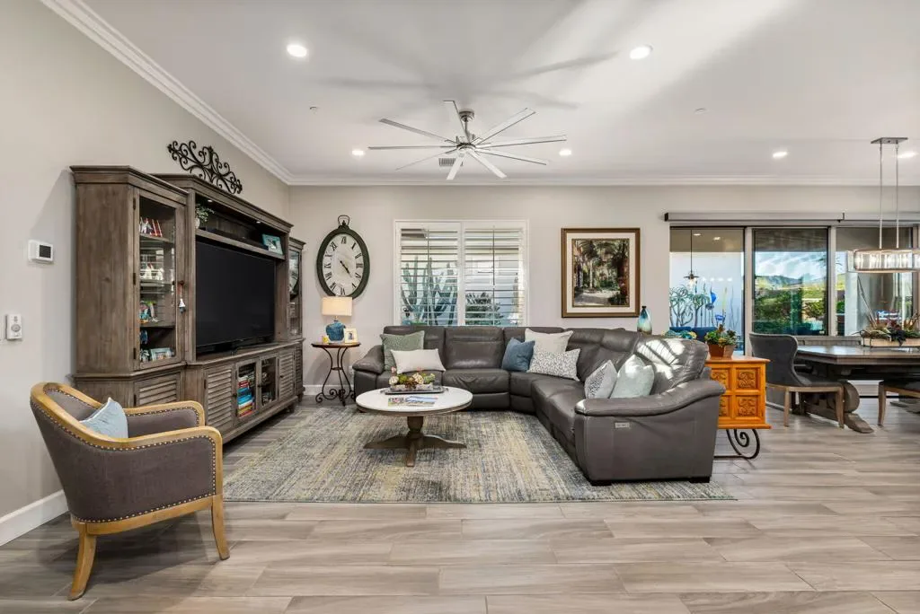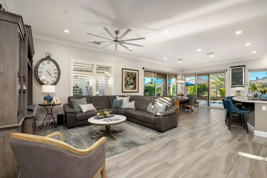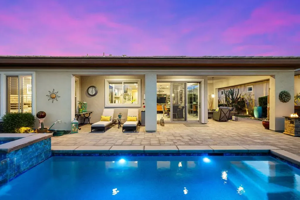 An exquisite Trilogy Polo Club sanctuary, this Immaginare single-family stunner blends luxury and livability with a resort-style, heated Pebble Tec pool and spa, an elegant saltwater system, and a beautifully curated 3-bedroom, 2.5-bath layout with a sophisticated den/office featuring an accent wall of wood and a custom floor-to-ceiling lighted bookcase. A wrought-iron privacy gate ushers you into a dramatic foyer with a custom ceiling, leading to an expansive great room anchored by a stacked-stone fireplace and bespoke illuminated shelving, complemented by plantation shutters, automatic privacy shades, crown molding, and rolling glass walls that dissolve the boundary between indoors and the lush greenbelt beyond. The gourmet kitchen elevates every culinary moment with quartz countertops, espresso cabinetry with custom pulls, stainless appliances including a GE Monogram 42” built-in refrigerator and GE Cafe package with beverage cooler, a striking tile backsplash, gas cooktop with custom hood, and an entertainer’s island with bar seating. High-grade ceramic plank flooring, upgraded ceiling fans, paver driveway, and enhanced desert landscaping with fountains and artificial turf add refinement at every turn, while the primary retreat indulges with dual vanities, a soaking tub, floor-to-ceiling tiled shower, and a Closet World system. A true rarity, the 3-car garage features epoxy floors, storage racking, and split A/C in both bays, and the expanded paver patio with metal sunshade creates an outdoor haven perfect for unwinding beside the cascading spa. With an Eco water softening system and kitchen reverse osmosis completing the package, this home delivers an unparalleled blend of sophistication, comfort, and resort-style living. Membership transfer fee is $3000.00 at time of purchase by Buyer versus Standard membership fee of $20,000.00.