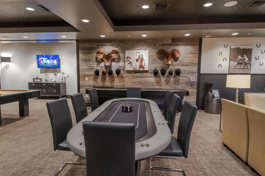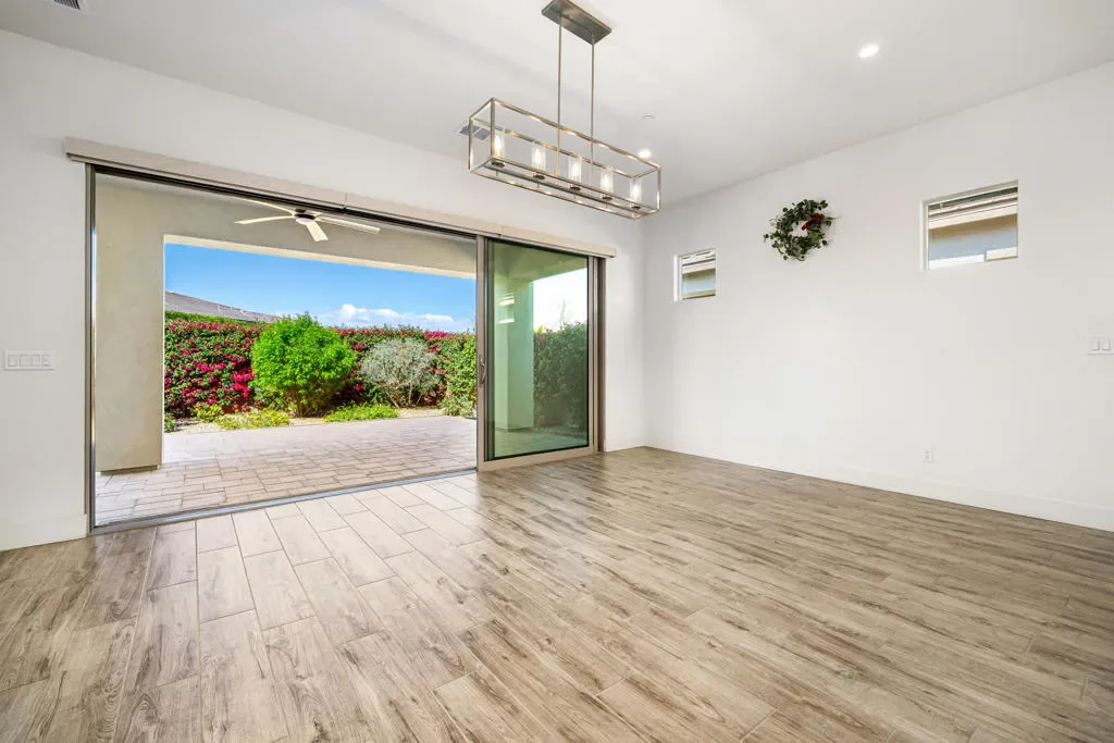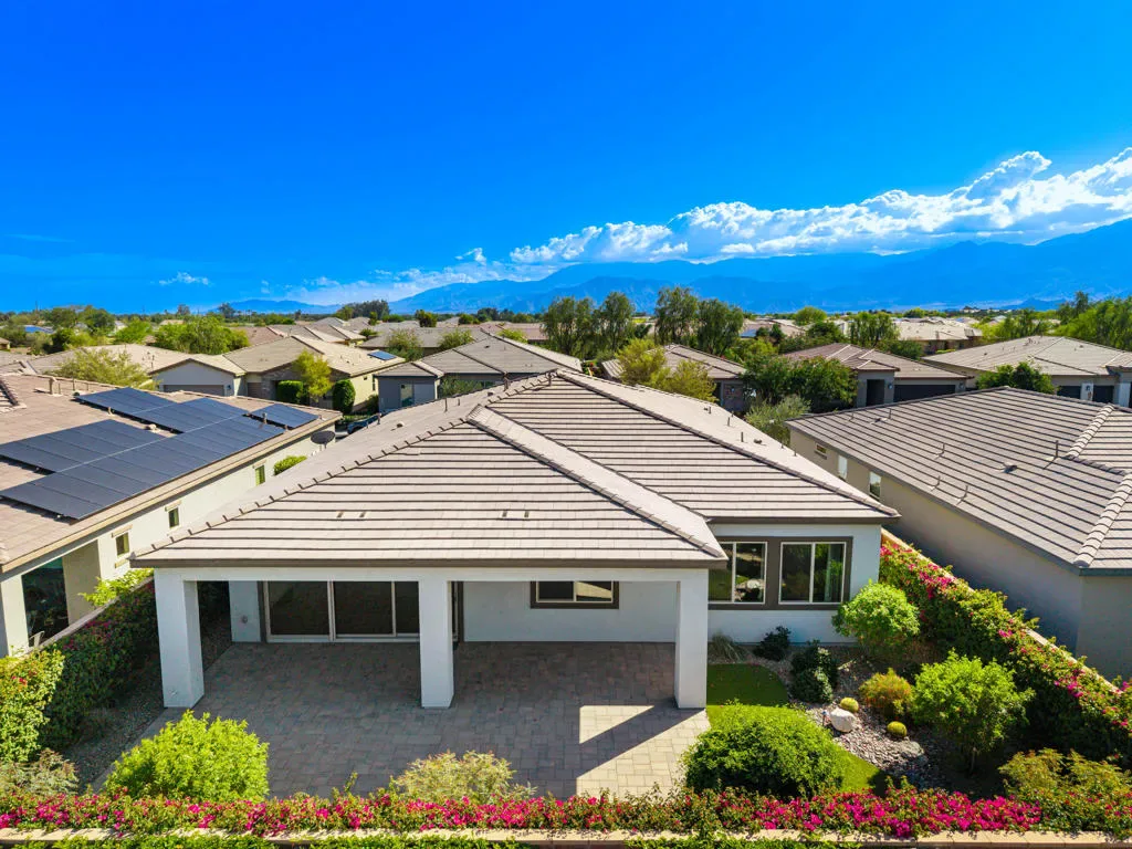 Life at the Trilogy Polo Club is among the finest in the Coachella Valley. This stunning contemporary Liberty model 2,357 square foot, 3-bedroom, 3-full baths home with office, is upgraded to the max. The quality and artful design of the home and natural beauty of the Polo Club resort makes every day living extraordinary. Once inside your greeted by 10 ft. ceilings, sparkling custom lighting, and inviting wide-plank tile floors. Off the hallway is an executive-sized room with tall custom glass doors perfect as an office, study or game room. The great room with a large linear fireplace, 70” big screen TV against a wall of marble is a great place to relax, read, and stream your favorite shows. The windows feature custom electric shades, and a 5-ton Lennox gas heating and cooling system with UV sterilization and whole house attic air filter keep air quality and temperature perfect year-round. A wall of triple glass sliding doors provides a seamless flow between indoor and outdoor living and entertaining. The beautifully landscaped private backyard with covered patio and ceiling fan is a peaceful place to enjoy by day. By night, watch the brilliant colors of the sunset and the landscape light up against the dark night sky. The gourmet kitchen is inspiring with an abundance of custom white shaker cabinets, radiant quartz countertops against a custom glass subway tile backsplash and grand center island with pendant lighting. Upgraded professional stainless appliances include a six-burner gas cooktop and custom range hood, new refrigerator, oven, microwave, and dishwasher. The generous size and pantry make it easy to keep all your cooking appliances neatly tucked away. The spacious primary bedroom is a luxury retreat, with a built-in linear fireplace and above and opening for a 70” TV. The sumptuous bath radiates luxury with quartz counters and a large walk-in shower with custom tiles to the ceiling. The walk-in closet is thoughtful in design with custom built-ins to accommodate even the most prolific shoppers. Two comfortable additional guest bedrooms are located away from the primary bedroom. One is an ensuite with a full bath and walk-in closet while the third guest bedroom with an adjacent full bath, could double as an office with built-in cabinets and shelves plus a closet. The laundry room is oversized with white shaker cabinets, washer, dryer and deep sink. The 2-car plus extra golf cart garage has an epoxy flooring and built-in tool chest and storage.