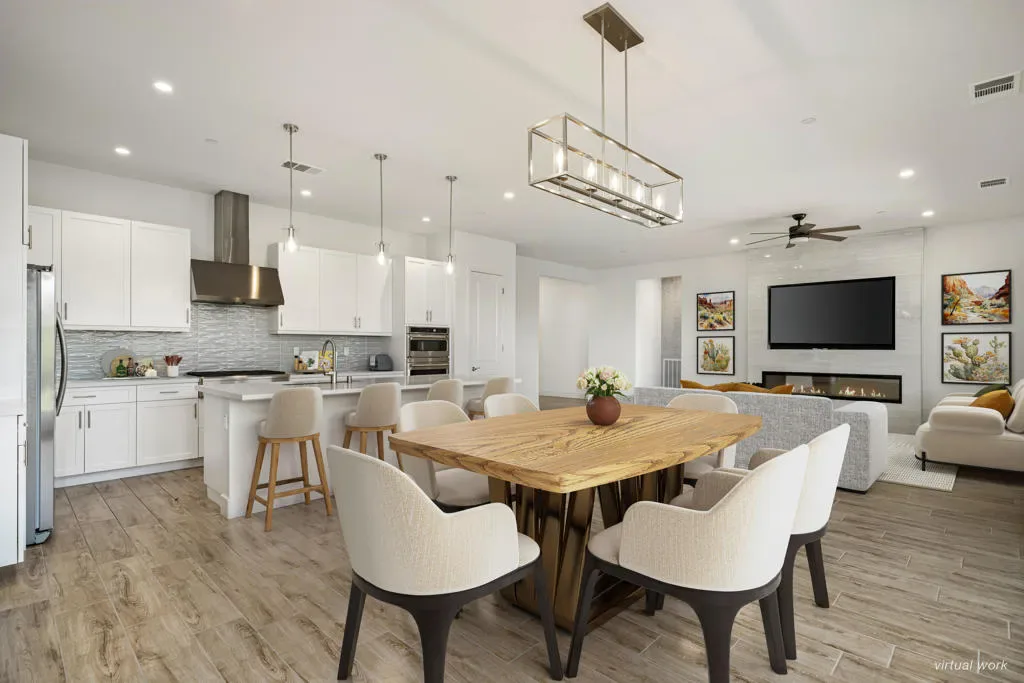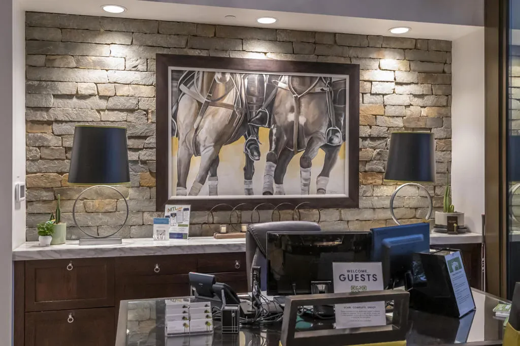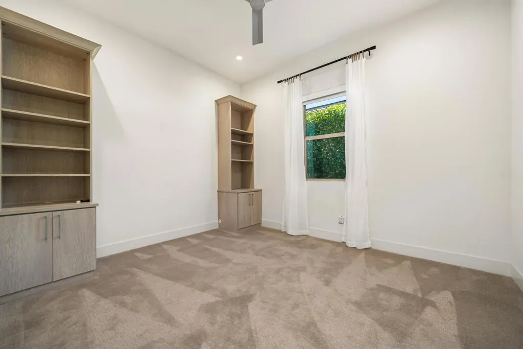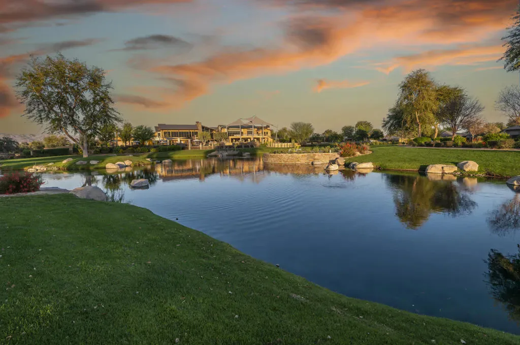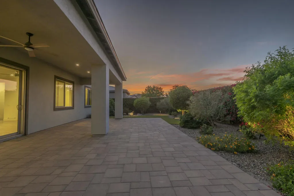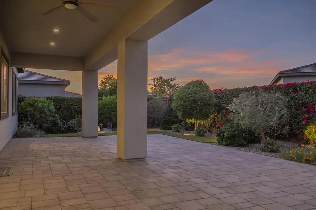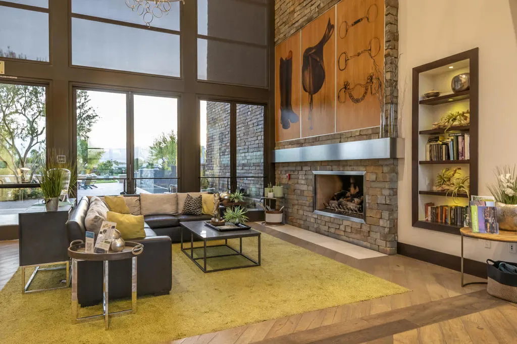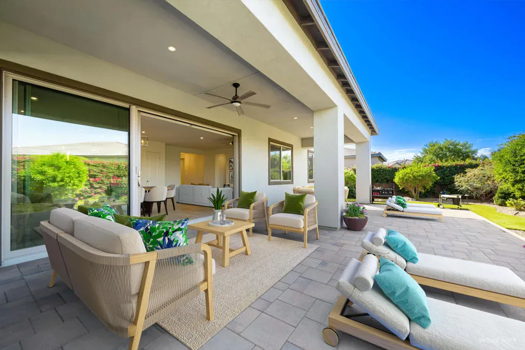 Life at the Trilogy Polo Club is among the finest in the Coachella Valley. This stunning Liberty model 2,357 square foot, 3-bedroom, 3-full bathroom home with office, is upgraded to the max. The quality and artful design of the home and natural beauty of the Polo Club resort makes every day living extraordinary. Step through the door and be captivated by the tall ceilings, sparkling custom lighting, and inviting wide-plank tile floors. Off the hallway is an executive-sized room with tall custom glass doors perfect as an office, study or game room. The great room with a large linear fireplace, 70” big screen TV against a wall of marble is a great place to relax, read, and stream your favorite shows. The windows feature custom electric shades, and a 5-ton Lennox gas heating and cooling system with UV sterilization and whole house attic air filter keep air quality and temperature perfect year-round. A wall of triple glass sliding doors provides a seamless flow between indoor and outdoor living and entertaining. The beautifully landscaped private backyard with covered patio and ceiling fan is a peaceful place to enjoy by day. By night, watch the brilliant colors of the sunset and the landscape light up against the dark night sky. The gourmet kitchen is inspiring with an abundance of custom white shaker cabinets, radiant quartz countertops against a custom glass subway tile backsplash and grand center island with pendant lighting. Upgraded professional stainless appliances include a six-burner gas cooktop and custom range hood, new refrigerator, oven, microwave, and dishwasher. The generous size and pantry make it easy to keep all your cooking appliances neatly tucked away. The spacious primary bedroom is a luxury retreat, with a built-in linear fireplace and above and opening for a 70” TV. The sumptuous bath radiates luxury with quartz counters and a large walk-in shower with custom tiles to the ceiling. The walk-in closet is thoughtful in design with custom built-ins to accommodate even the most prolific shoppers. Two comfortable additional guest bedrooms are located away from the primary bedroom. One is an ensuite with a full bath and walk-in closet while the third guest bedroom with an adjacent full bath, could double as an office with built-in cabinets and shelves plus a closet. The laundry room is oversized with white shaker cabinets, washer, dryer and deep sink. The 2-car plus extra golf cart garage has an epoxy flooring and built-in storage.