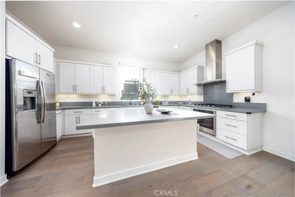 The kitchen includes quartz countertops, a large center island, stainless steel appliances, and ample cabinetry.