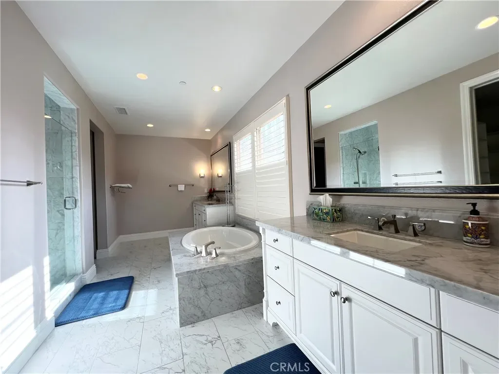 Master Suite – walk-in closet, dual vanities, separate bathtub, and glass-enclosed shower.