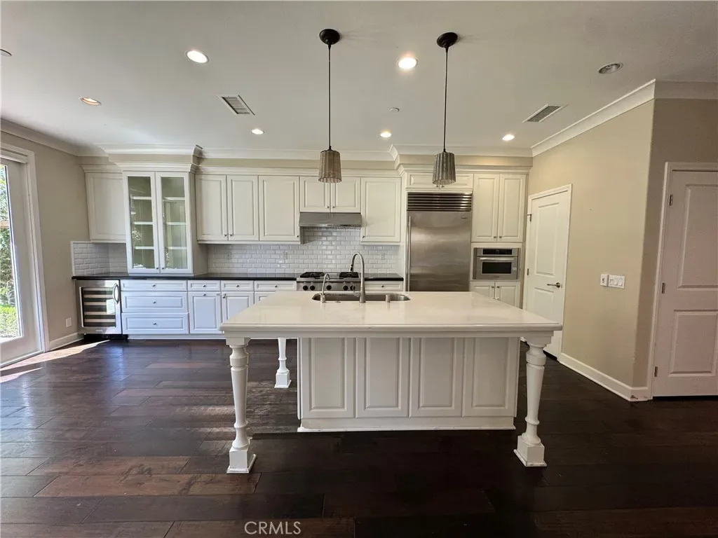 At the heart of the home is a highly upgraded gourmet kitchen, beautifully appointed with granite countertops, a full designer backsplash, elegant glass-door cabinetry, and two stylish pendant lights that add warmth and ambiance. Premium appliances include a Sub-Zero refrigerator and a built-in wine cooler—perfect for the culinary enthusiast. The kitchen opens seamlessly to the inviting family room, creating a bright, airy great room.