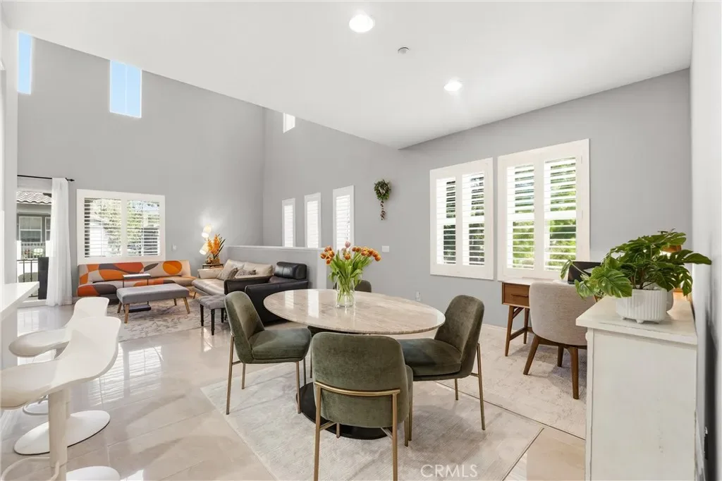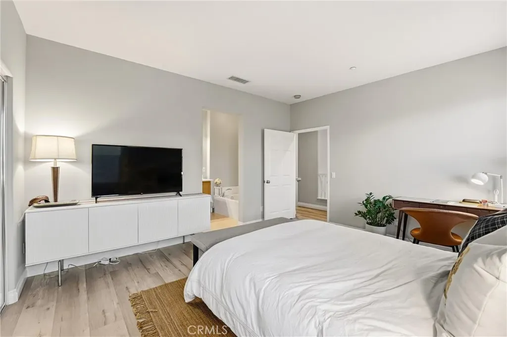 Privately situated on its own level, the luxurious primary suite offers a tranquil retreat complete with a spa-inspired bathroom featuring dual vanities, a relaxing soaking tub, and a separate walk-in shower.