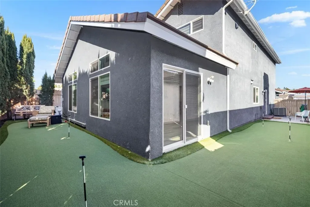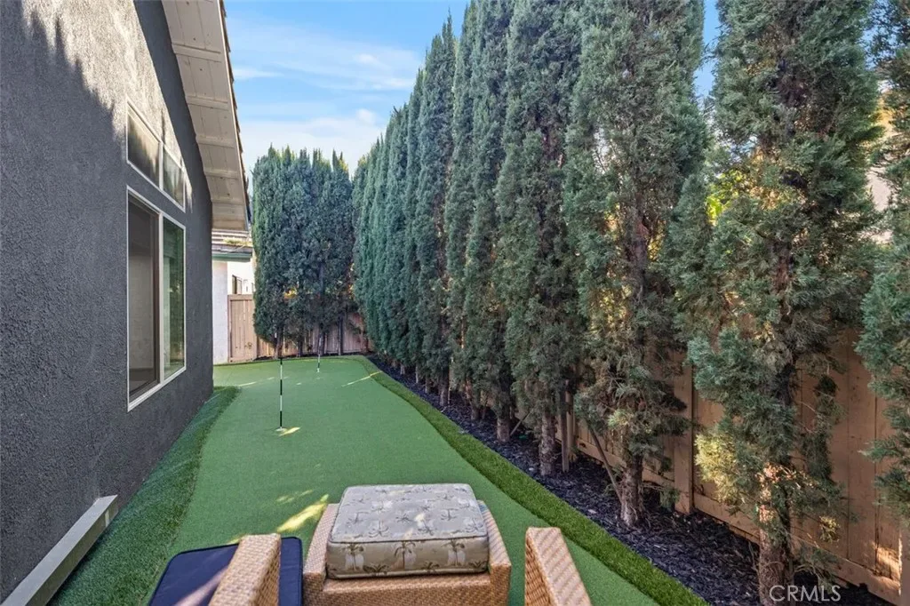 Step outside to your private backyard retreat, designed for relaxation and entertaining, complete with a custom putting green so you can unwind or sharpen your short game at home.