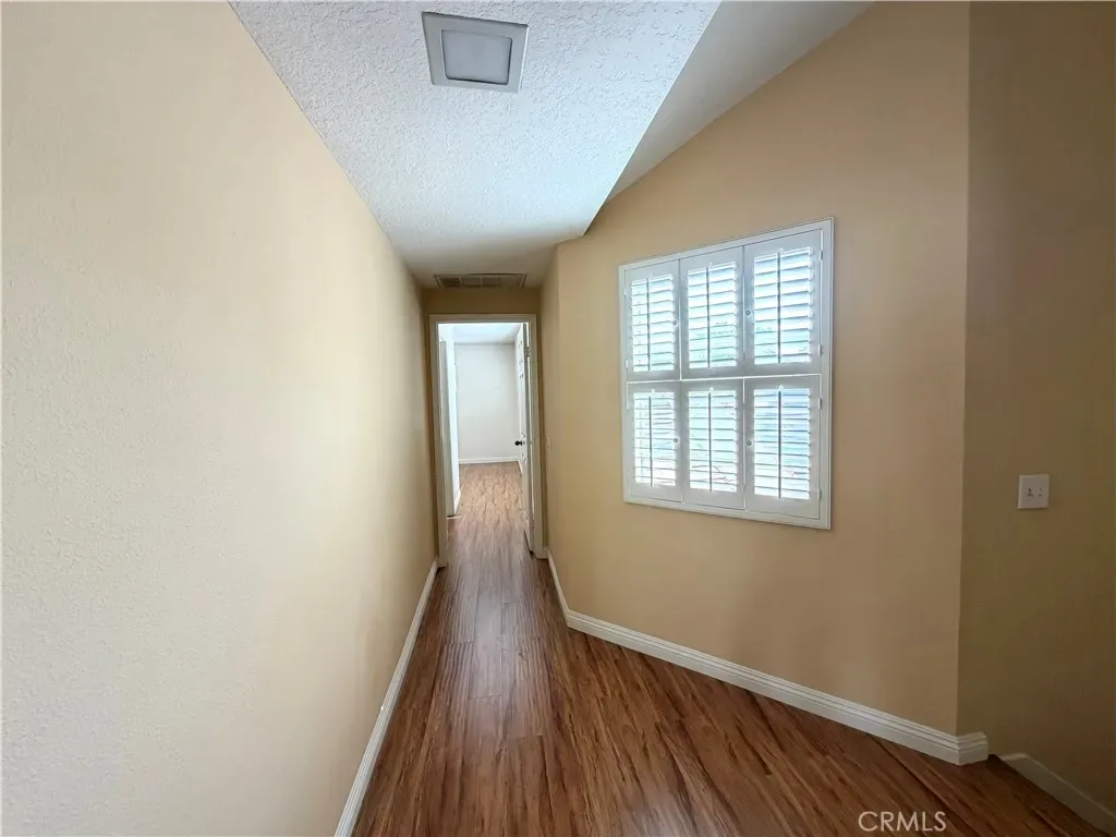 Private atrium along with an open kitchen that offers direct access to a two-car garage and adjacent courtyard. Neutral tones and laminate wood flooring create a clean aesthetic.
