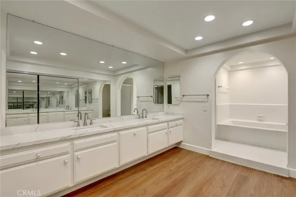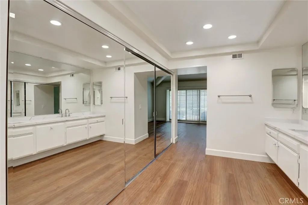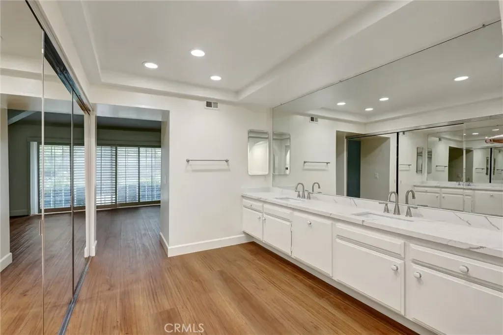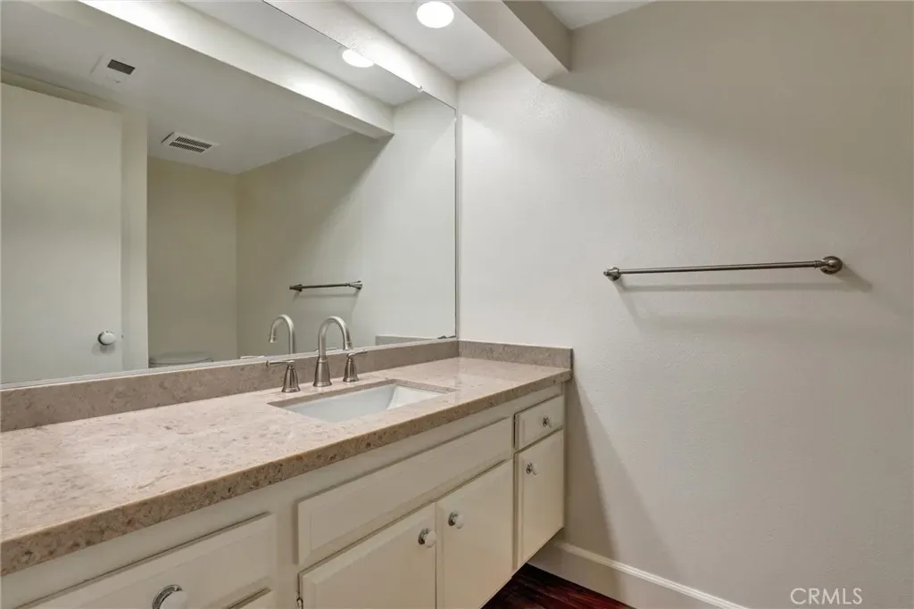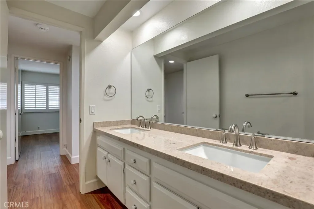 The master bedroom is a spacious room on the downstairs level with its own sliding glass door leading into the backyard, huge bathroom and Roman bath as well as shower and bathroom areas. It also contains two large closets and living space. The other three bedrooms are located upstairs and contain ample windows with natural light and mirrored closet sliding doors. They share a newly renovated bathroom with double sinks, quartz counter, fixtures, flooring and a shower/tub.