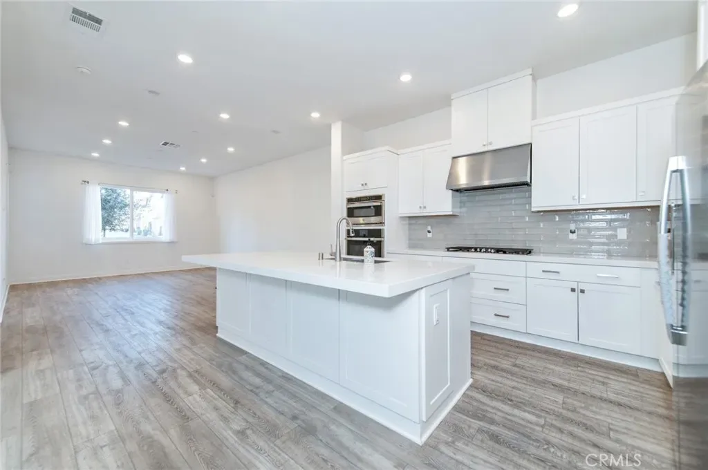 The main living area encompasses a generously sized open-concept space that seamlessly integrates the living room, dining area, and gourmet kitchen. This setup is perfect for entertaining guests or spending quality time with family. The kitchen boasts quartz countertops, high-end stainless steel appliances including cooktop, refrigerator, dishwasher. There is also a half bath on the first floor.