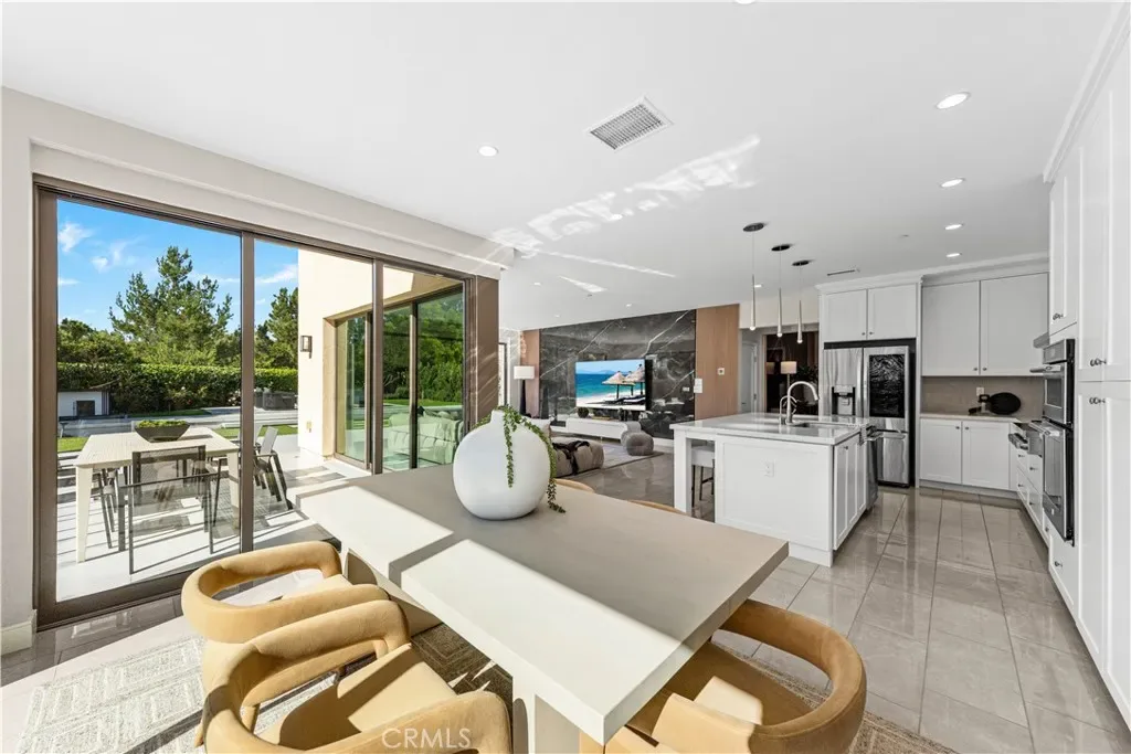 The transition indoors is completely seamless. Massive floor-to-ceiling multi-panel sliding glass doors fully retract, inviting you into a brilliantly designed open-concept layout. Filled with natural light, the home features sleek high-gloss tile flooring, while the unobstructed sightline from the entry extends directly to the lush outdoor space, reinforcing the home’s incredible sense of openness.