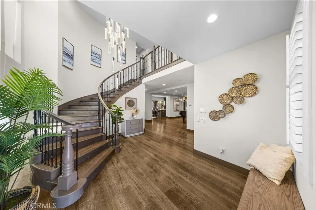 Upon entry, you’re greeted by soaring ceilings and an elegant spiral staircase and custom grand Chandelier. The main level features 11-ft ceilings, Designer paint and Engineer wood flooring are prominent throughout the home.