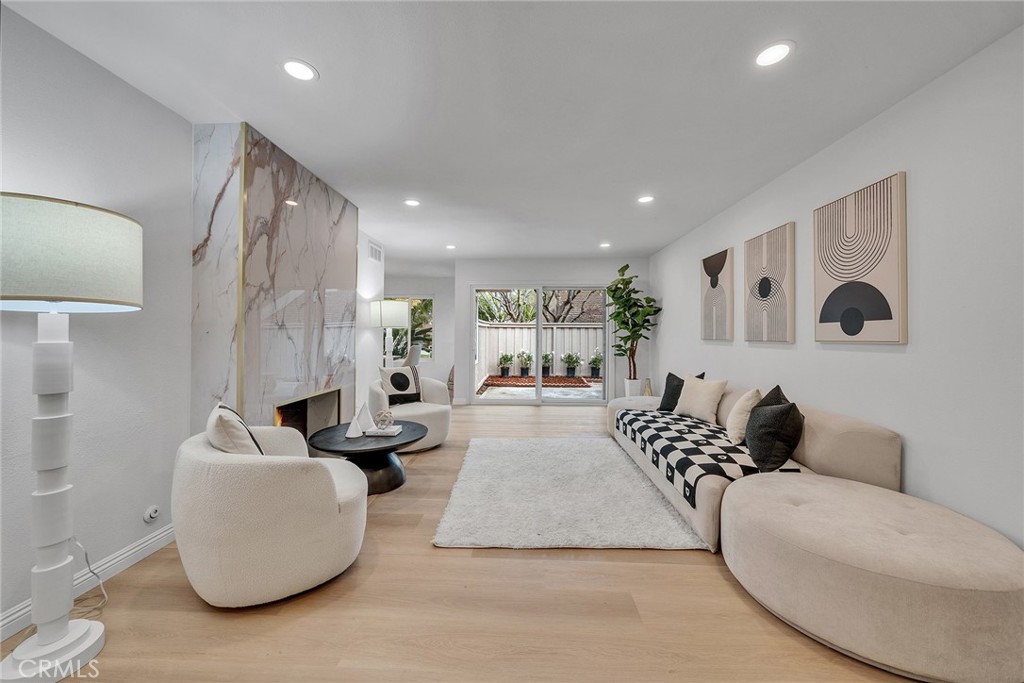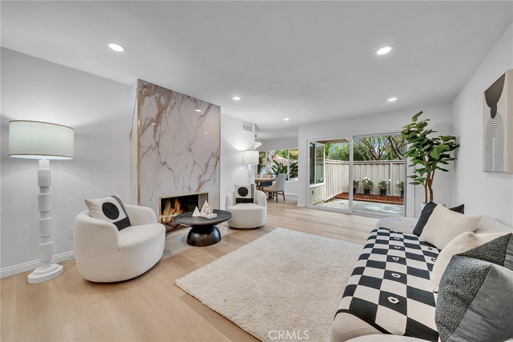 The spacious living room features an open layout ideal for both daily living and entertaining, seamlessly connecting to the dining area and fully remodeled kitchen. The kitchen showcases upgraded cabinetry, quartz or granite countertops, designer backsplash, stainless steel appliances, and ample counter space. An adjacent dining area overlooks the private backyard, offering a warm and welcoming setting.